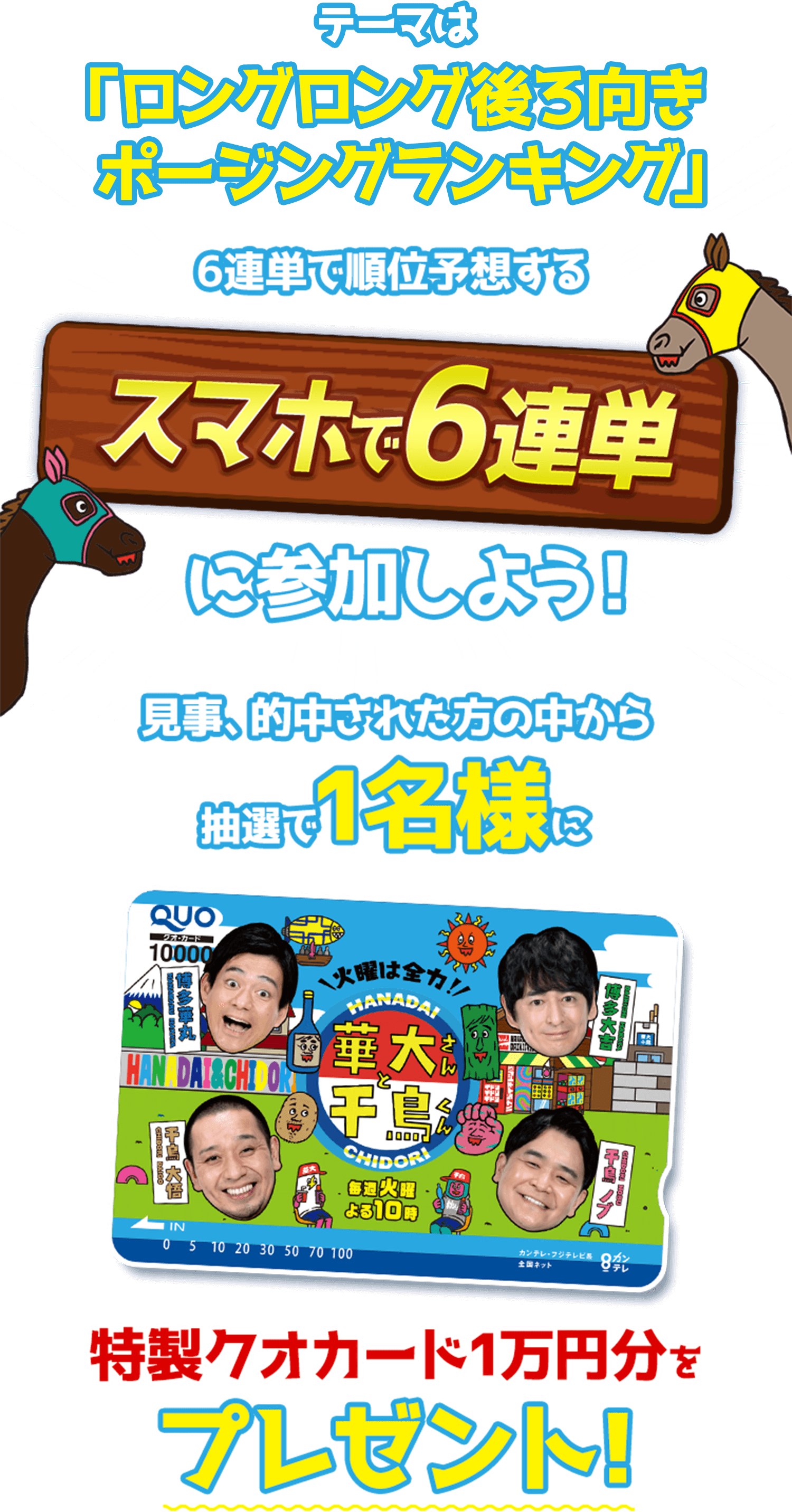 「華大さんと千鳥くん スマホで6連単」にご参加いただくにあたり、以下に記載しております内容をお読みいただき、同意のうえご応募くださいますようお願いいたします。ご応募いただいた時点で、同意いただいたものといたします。