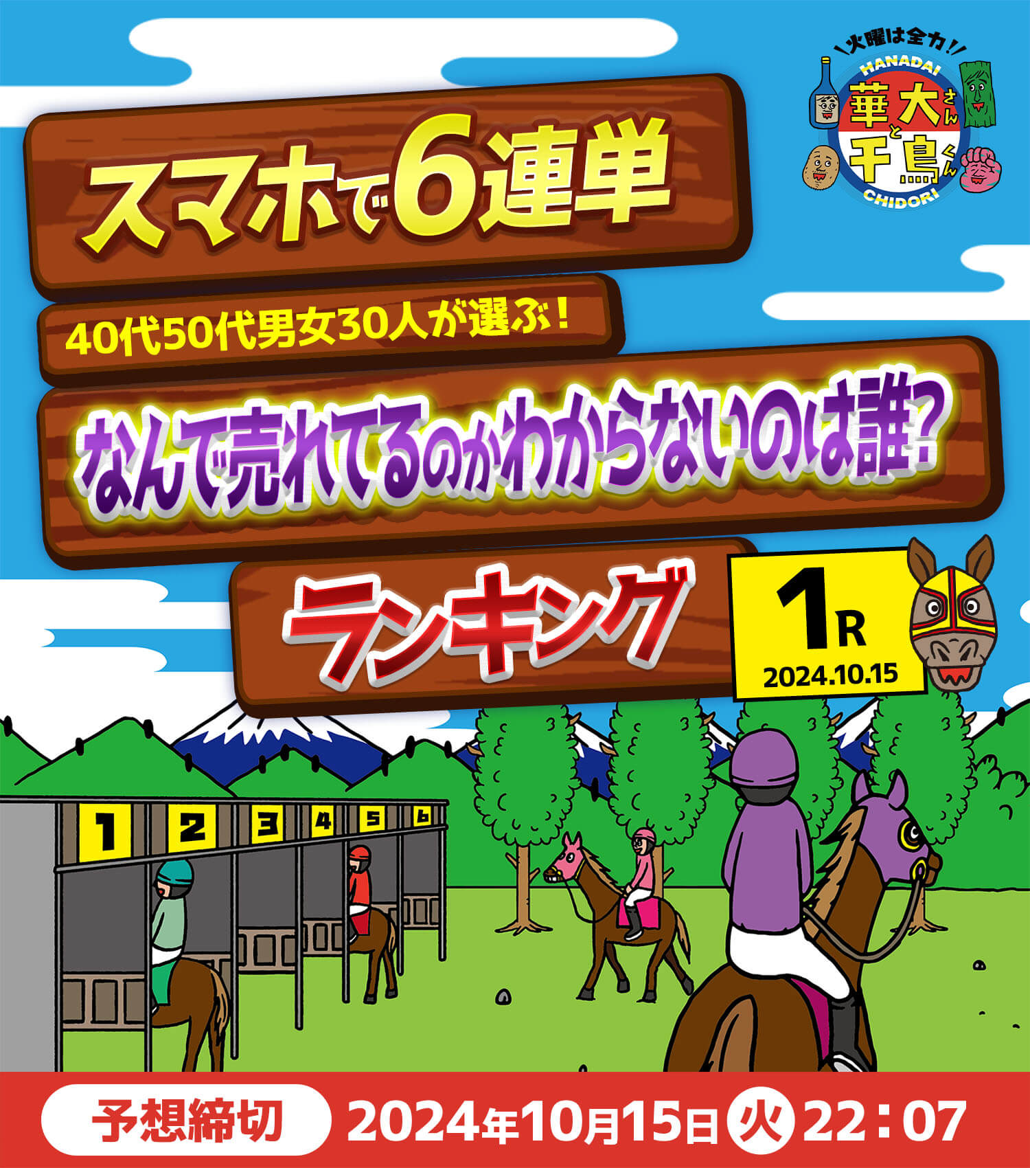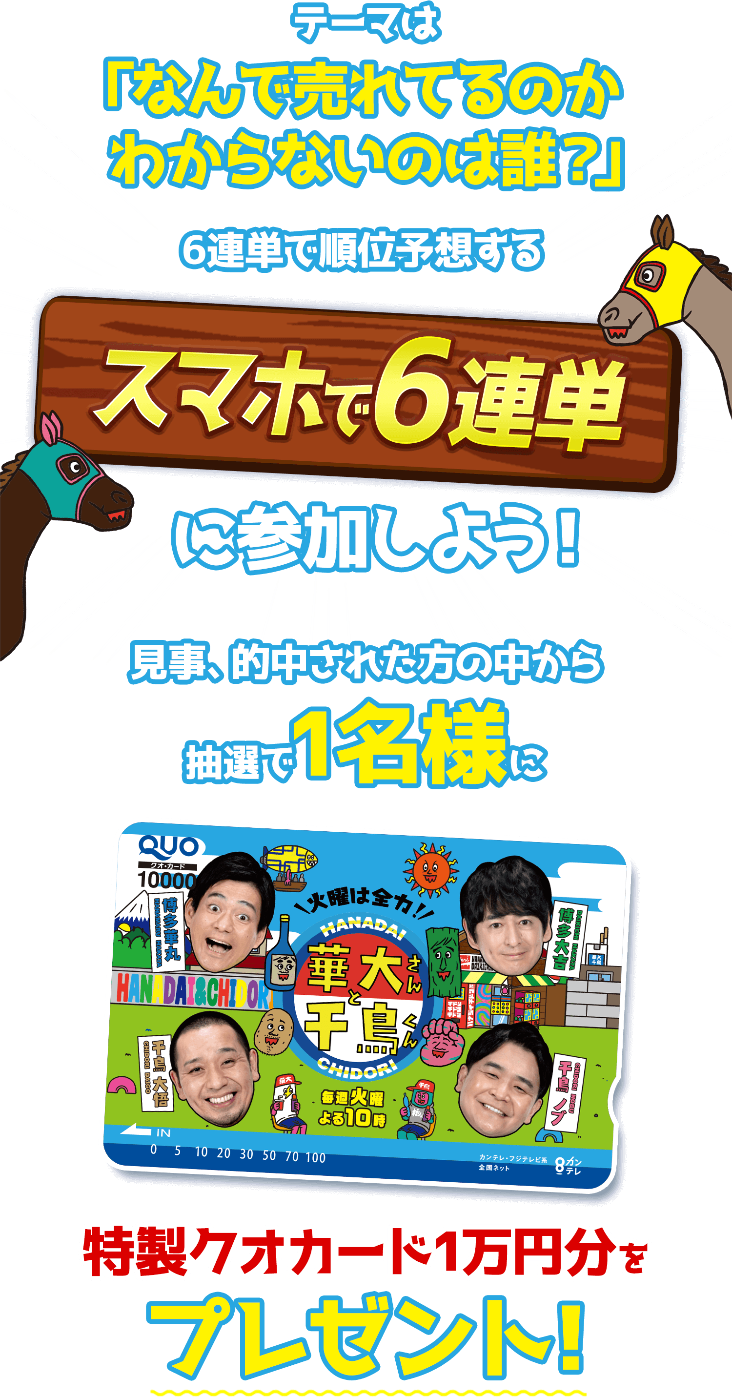 「華大さんと千鳥くん スマホで6連単」にご参加いただくにあたり、以下に記載しております内容をお読みいただき、同意のうえご応募くださいますようお願いいたします。ご応募いただいた時点で、同意いただいたものといたします。