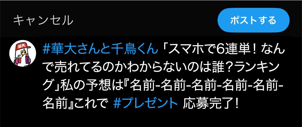 ※ハッシュタグ(#華大さんと千鳥くん)は消去・変更せずに投稿お願いします。