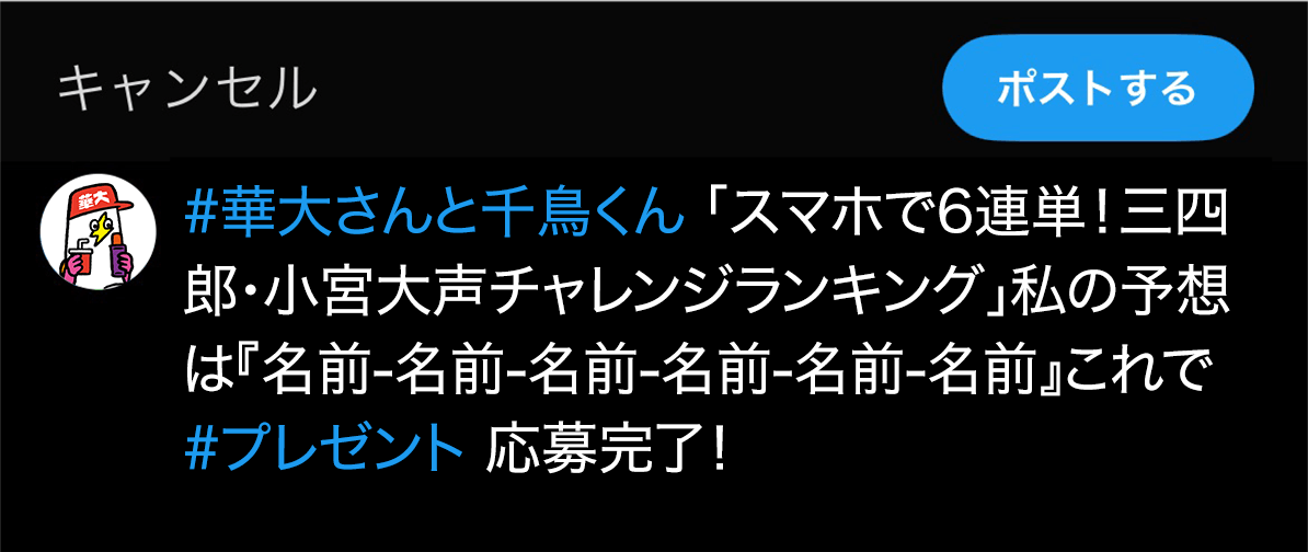 ※ハッシュタグ(#華大さんと千鳥くん)は消去・変更せずに投稿お願いします。