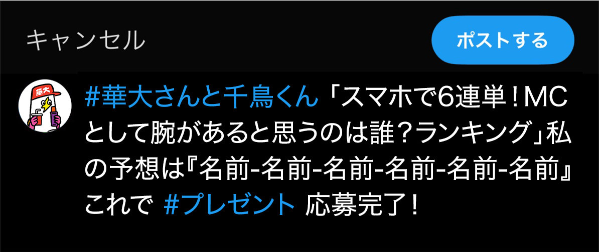 ※ハッシュタグ(#華大さんと千鳥くん)は消去・変更せずに投稿お願いします。