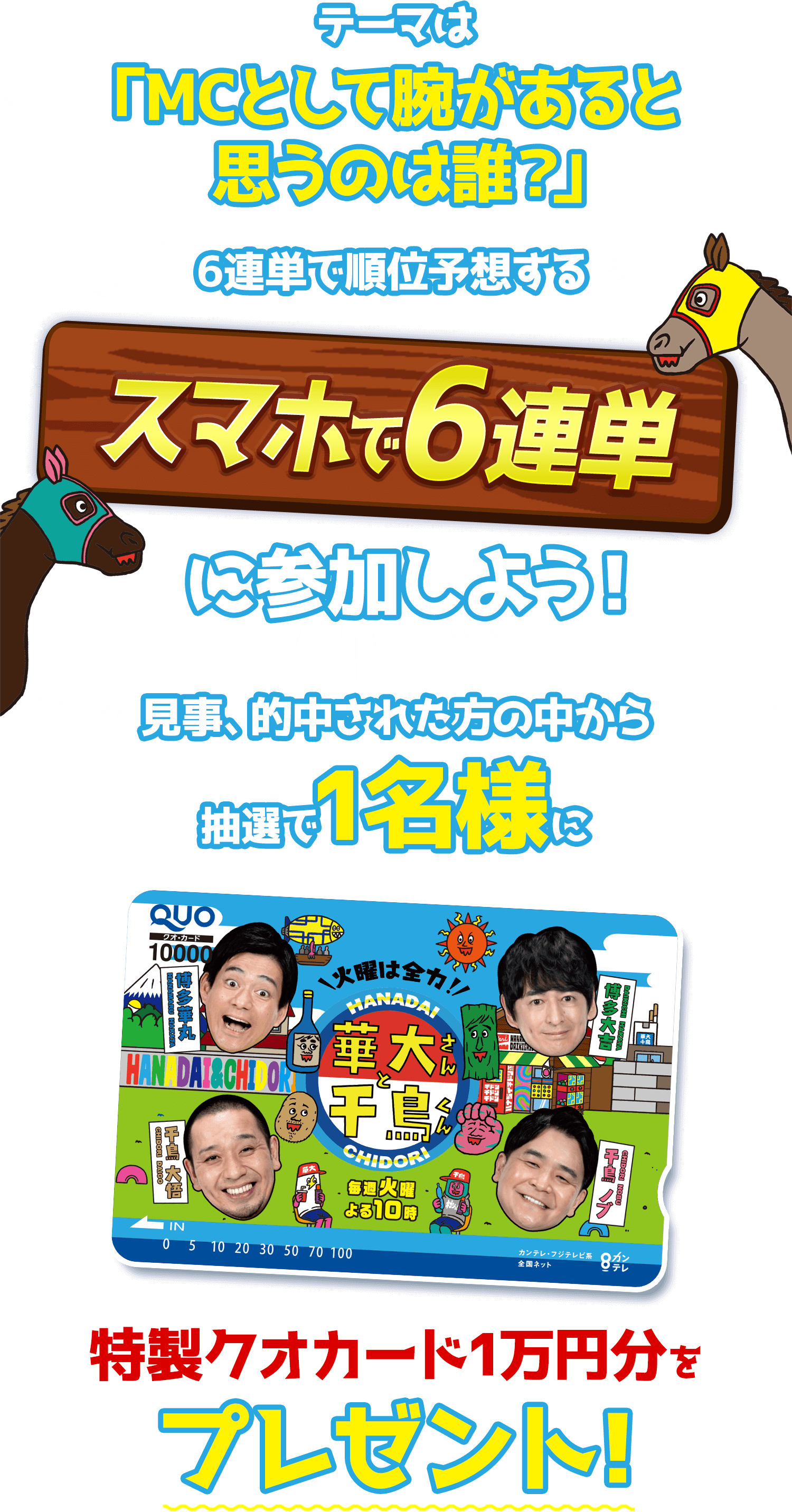 「華大さんと千鳥くん スマホで6連単」にご参加いただくにあたり、以下に記載しております内容をお読みいただき、同意のうえご応募くださいますようお願いいたします。ご応募いただいた時点で、同意いただいたものといたします。