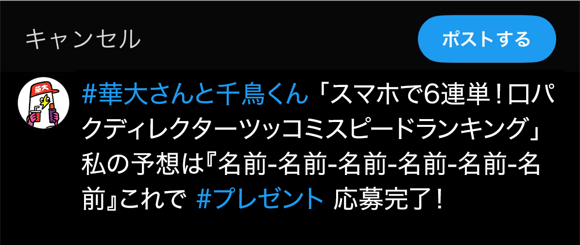 ※ハッシュタグ(#華大さんと千鳥くん)は消去・変更せずに投稿お願いします。