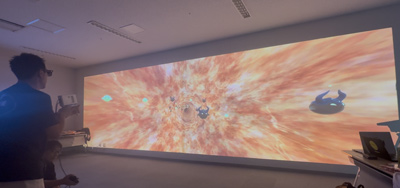 横12mのパノラマシアターを明るさ12,000ルーメンのプロジェクター2台で構築しました。