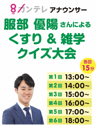 また、カンテレアナウンサー服部優陽による、薬&雑学クイズ大会も開催します(13時~18時、計6回)。