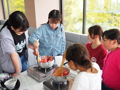 ◆6年生2人で協力して、人生初のジャム作りをしました。あつかったし、いちごが全然つぶれなかったし、いろいろ大変だったけど、やっぱり友だちと協力して作るのは楽しいなと感じました。そして、自分たちで作ったジャムはいつもの何倍もおいしくて、今回キャンプに参加してよかったと感じました。(小6女子)