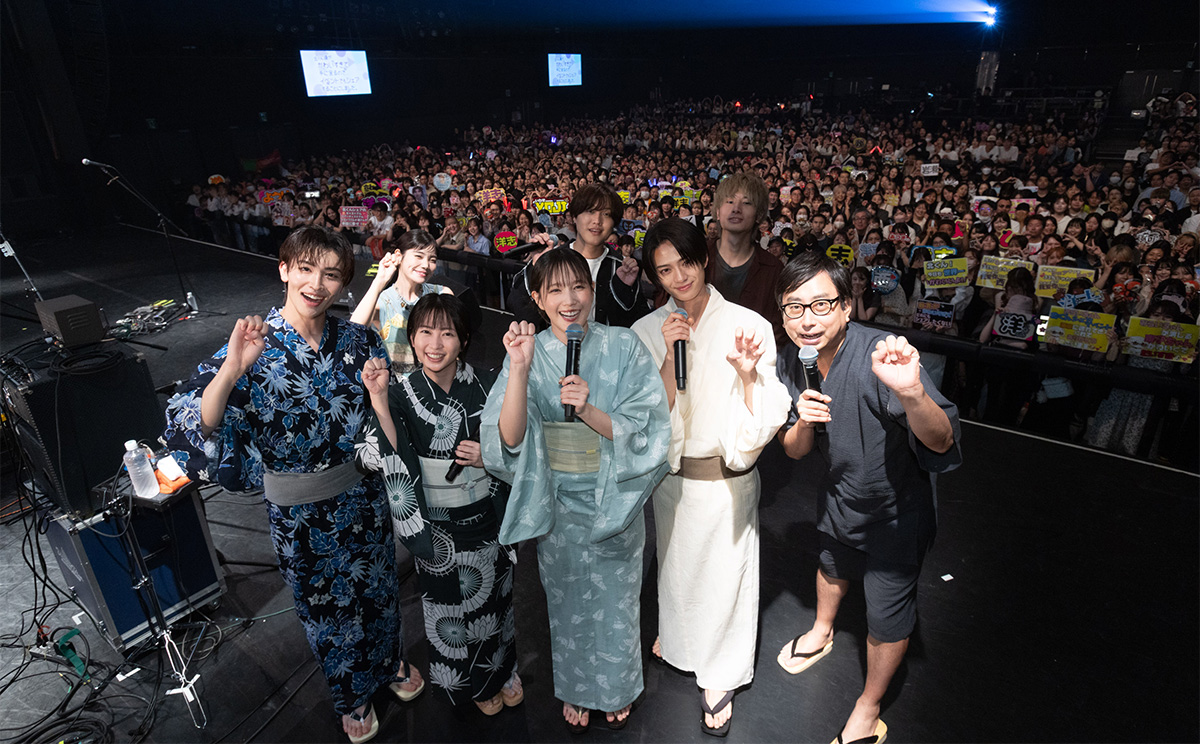 この歓声に岩瀬は「愛を感じます」と感謝。志田は「こんな景色が見られるなんてご褒美ですね。感無量です」と目の前にいる多くのファンに感激。増子は「楽しむ準備できてますかー!夏の思い出作りませんかー!よっしゃ!お願いします!」と気合十分。そして、本田が「楽しすぎて最初のほうに力尽きないように、最後まで楽しんで行きましょう!」と元気に呼びかけ、いざイベントがスタートするかと思いきや、「俺わーい!」と甚兵衛姿のおいでやす小田が舞台に登場し、観客も4人も大爆笑。会場がしっかり温まったところで、本田のタイトルコール&小田の掛け声でイベントがスタートした。