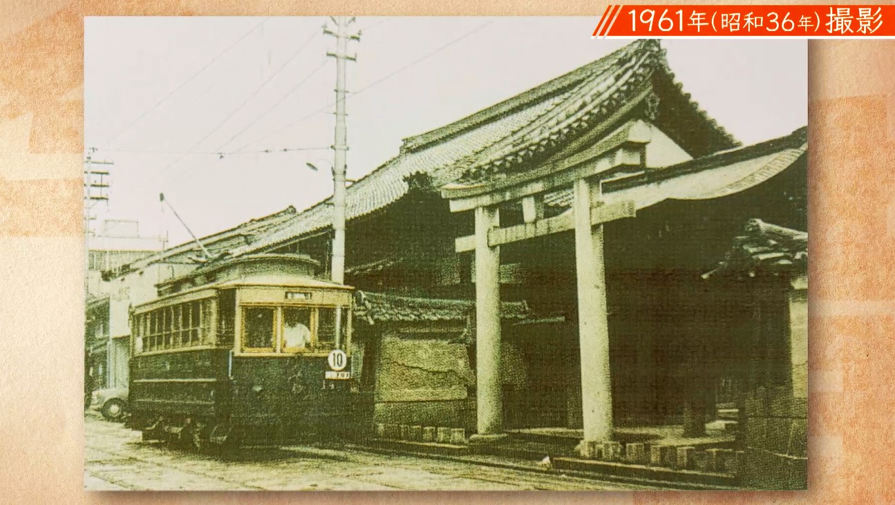 路面電車が、神社の前ギリギリのところを走っています。実は“不思議な地名”にゆかりのある写真なのだそうです。