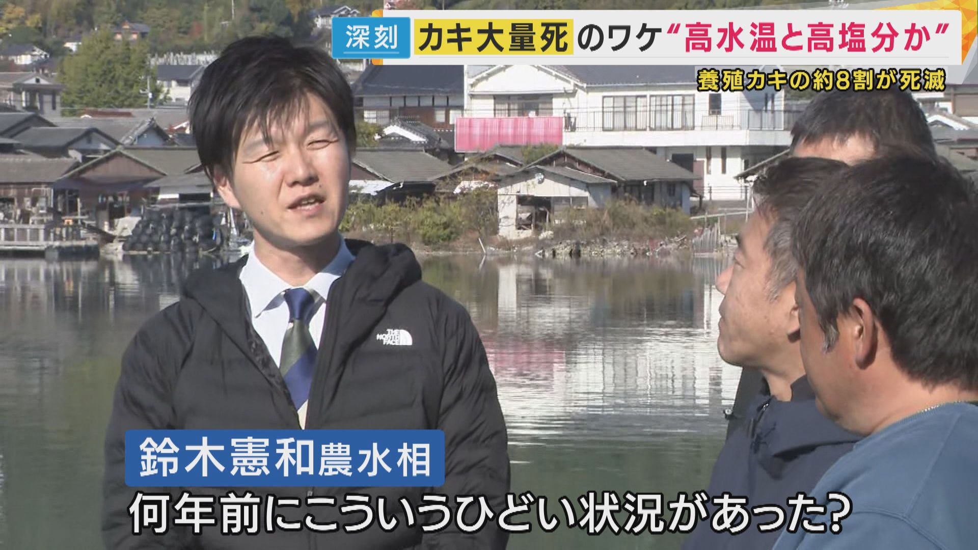 「何年前にこういうひどい状況があった?」と鈴木農水相が尋ねると、広島のカキ養殖業者は「ないですね。二十数年で初めて」と答えました。