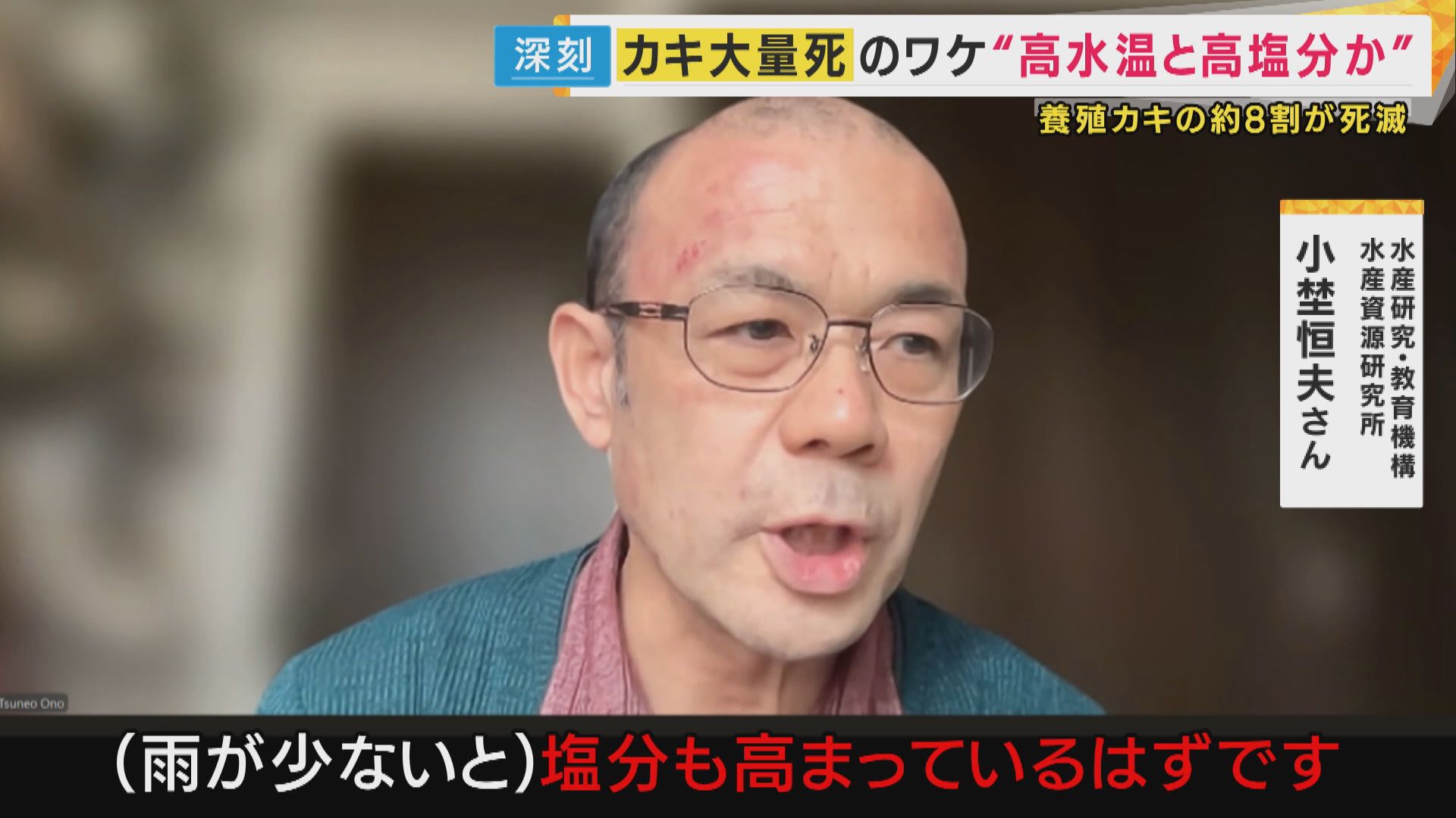 カキ養殖場で養殖カキのおよそ8割が死滅し、専門家は「地球温暖化も影響のひとつ」と警鐘を鳴らしています。背景には海水温と塩分濃度の上昇があるとみられています。