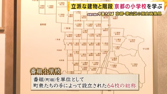 京都を廃れさせないよう、町の人々がお金を出して創設から運営まで行ったのが番組小学校。当時の町の区画「番組(町組)」に合わせて64校作られたため、そう呼ばれました。