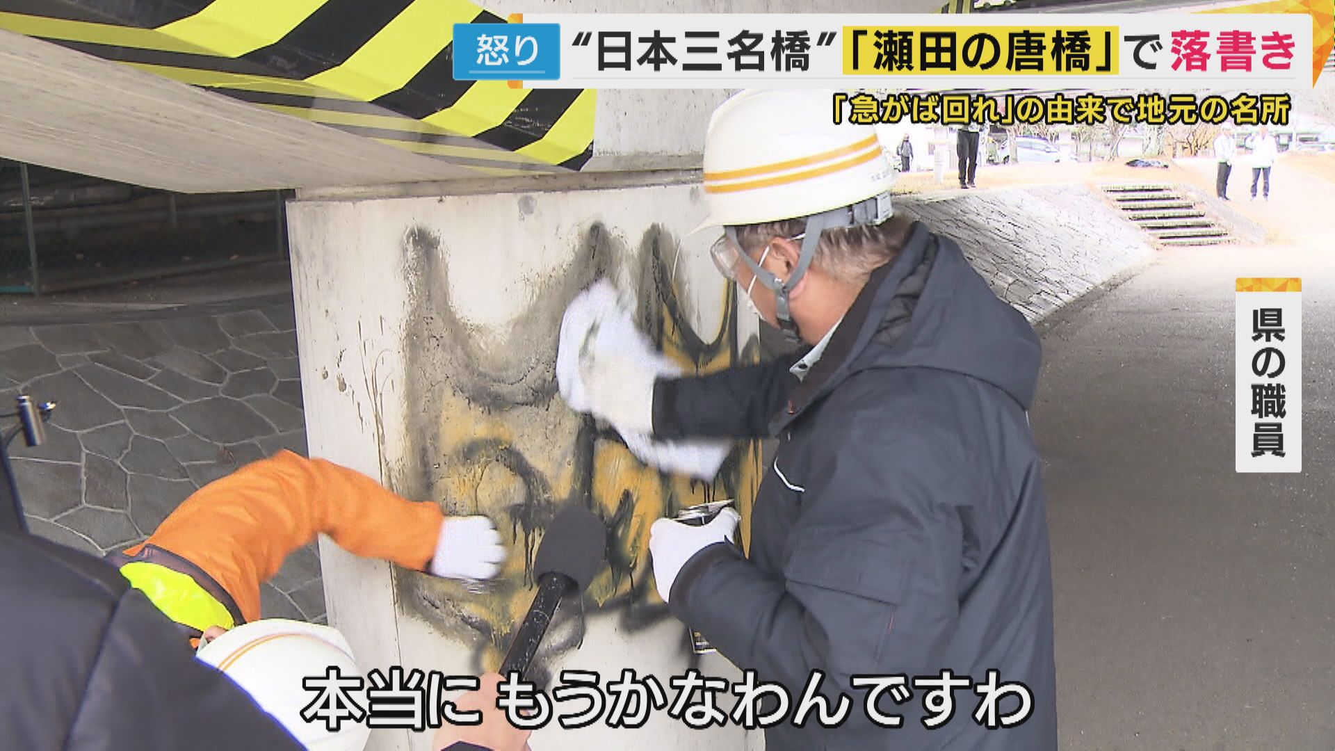 【地域の人】「これ(瀬田の唐橋)が見えたところがすごく気に入って、マンションを買った。買い物行くのもこの橋渡ったり、散歩するのもこの景色見ながら散歩するので私たちの生活の一部。だからそんな落書きなんて許せないです」