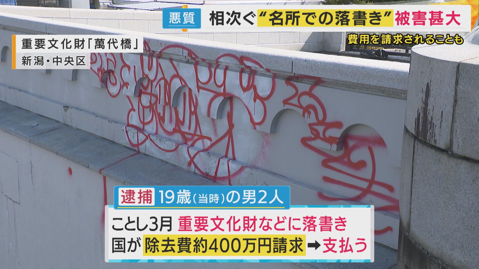 ことし3月、新潟市の重要文化財「萬代橋」の落書き事件で、当時19歳の男2人が落書きを消す費用として約400万円を請求され、支払いました。