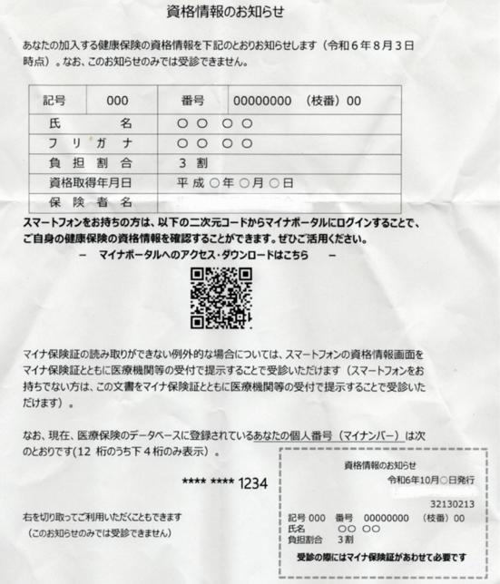 「資格情報のお知らせ」とは、マイナ保険証の利用登録者に送られるA4サイズの書類で、自分の健康保険の記号・番号などの資格情報が書かれています。