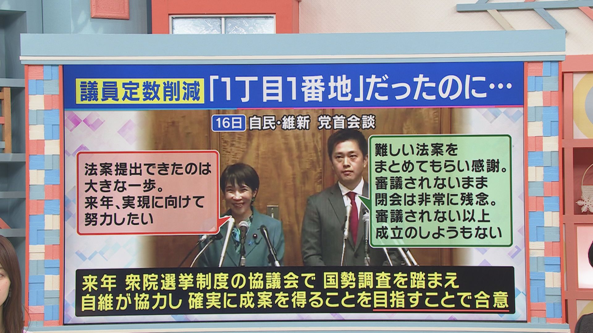 「年収の壁」引き上げが、自民と国民民主の間で合意に至る一方、維新の会が「1丁目1番地」と位置づけていた、「議員定数削減法案」は先送りとなりました。