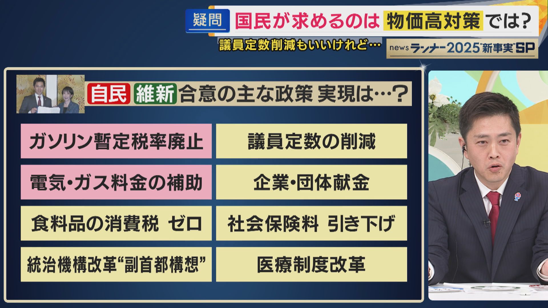 吉村代表は番組の中で、「2026年に最も実現したいこと」として「副首都法案」を掲げたものの、FNNの世論調査で「高市内閣の"評価する取り組み"」でも4割を占めた、「物価高対策」について語り、「食料品の消費税はゼロにすべき」と語りました。