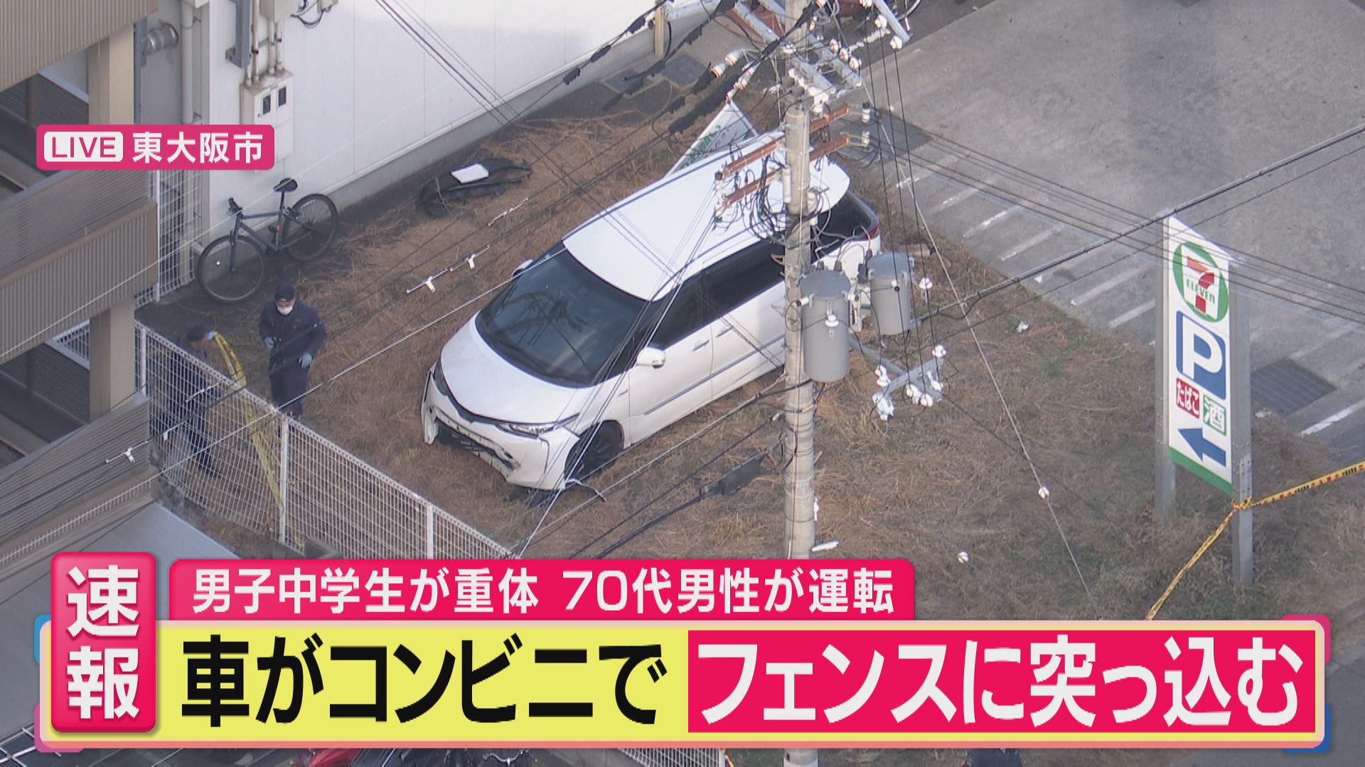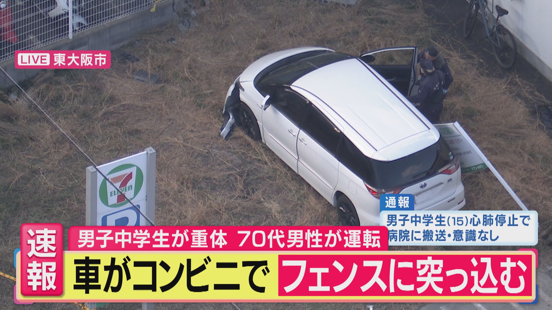 【速報】コンビニの駐車場内で乗用車が15歳の男子中学生をはねる 搬送先の病院で死亡確認 運転の70歳の会社員の男を過失運転致傷の疑いで現行犯逮捕 東大阪市01月06日 19:15