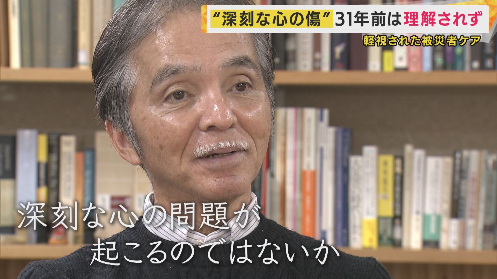 「日本で起きる災害の多くはね、過疎地で起きることが多い。そうすると報道として災害の被害状況は伝えるけども、被災した人の状況までは伝えないことが多かった。ところが阪神・淡路大震災は都市部で起きた。被災者がどういうふうな苦境に立たされてるかっていうことが国民に報道される災害だったんですよね。彼らが困ってる、しかもその心を非常に痛めてるってことが、みんなが知ることになったわけです」