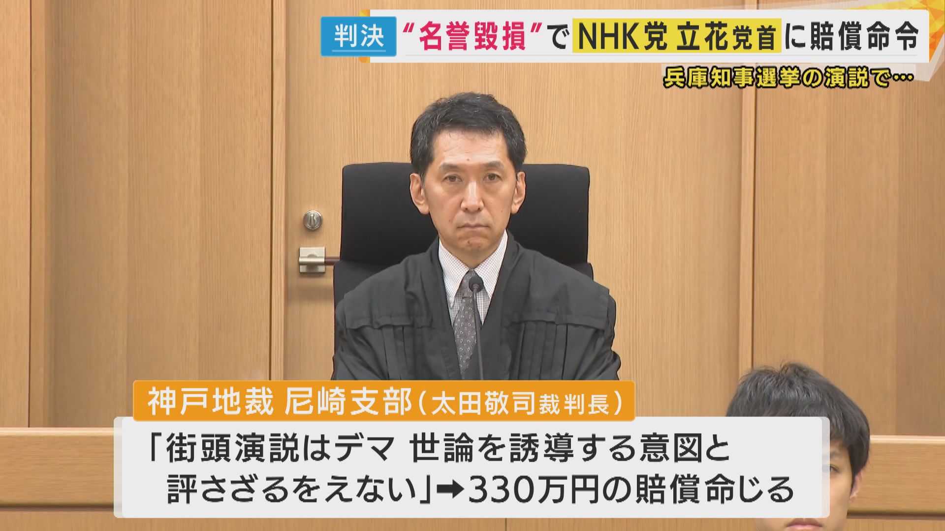 NHK党の立花孝志党首に街頭演説で、名誉を毀損されたとして兵庫県議が損害賠償を求めた裁判で、神戸地裁は立花党首に330万円の賠償を命じました。