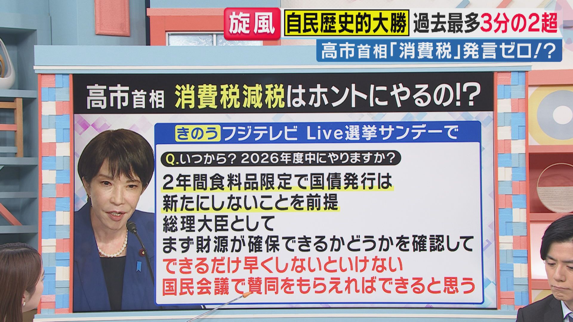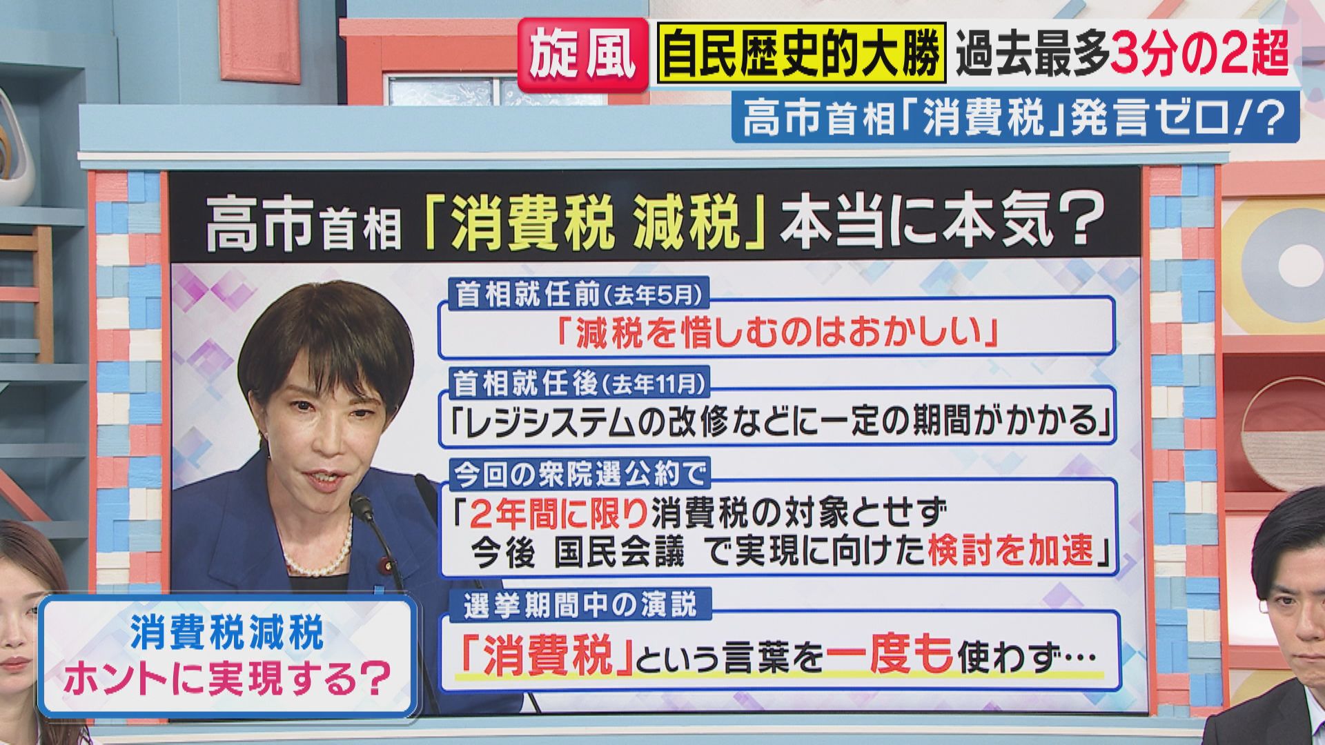 自民党が歴史的大勝を収め、過去最多となる3分の2以上の議席を獲得した選挙後、高市総理は消費税減税についてどのような見解を示しているのでしょうか。