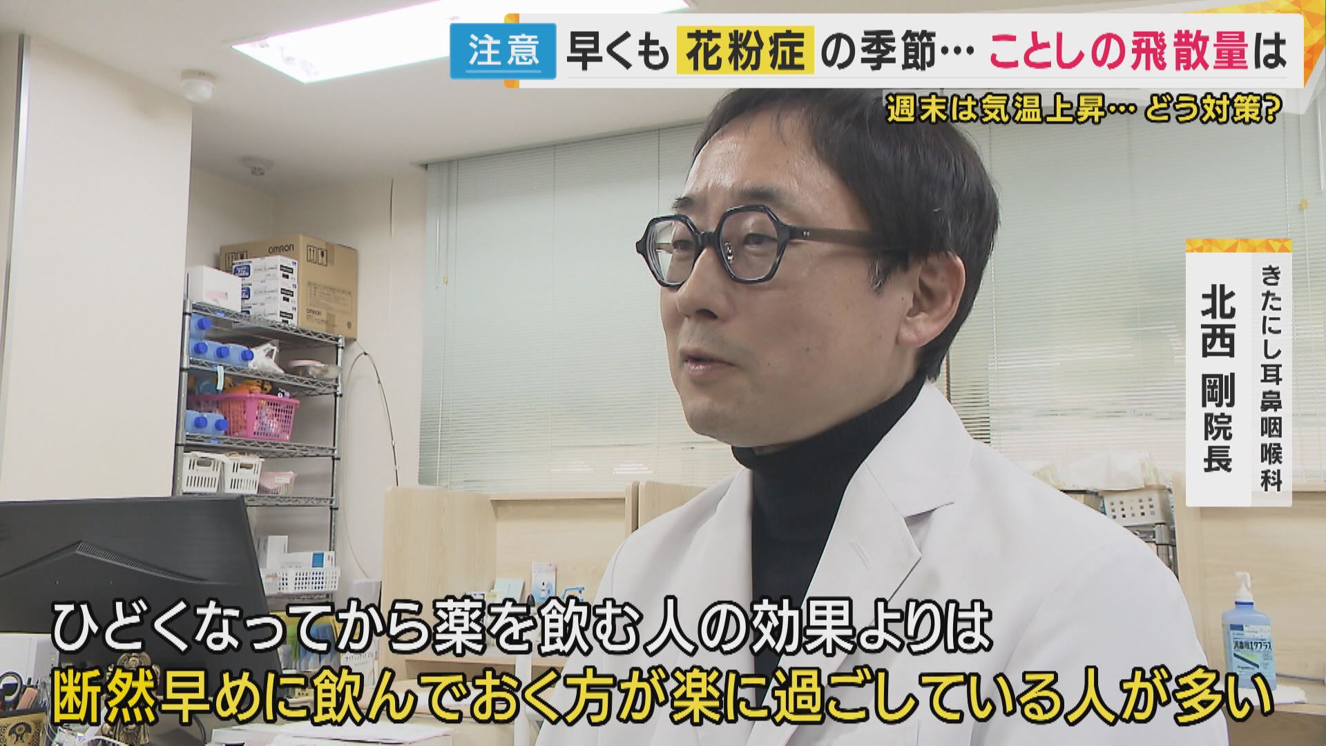 【きたにし耳鼻咽喉科 北西剛院長】「最近分かってきた薬の作用で、花粉が飛んでアレルギー物質が出る前から飲む意味がすごく最近強調されるようになってきた。ひどくなってから薬を飲む人の効果よりは、断然早めに飲んでおく方が楽にすごしている人が多い」