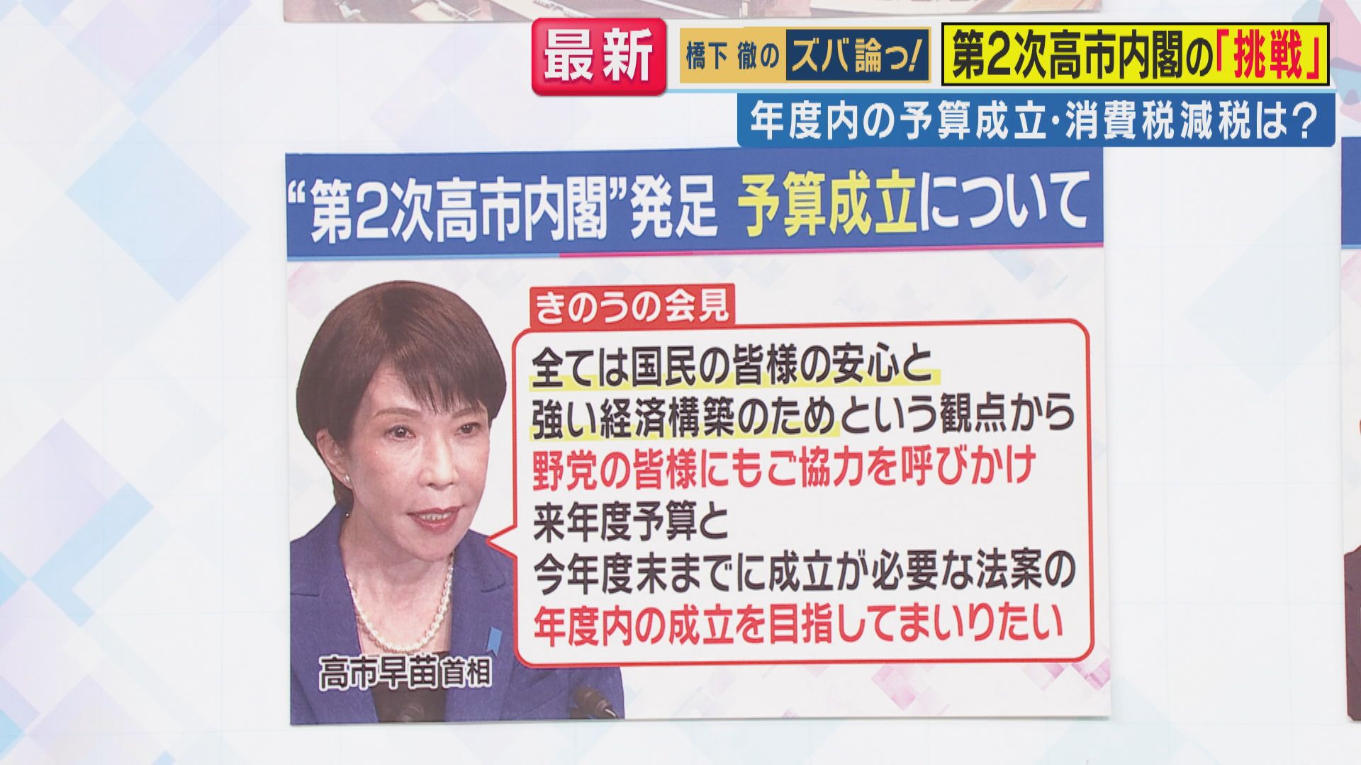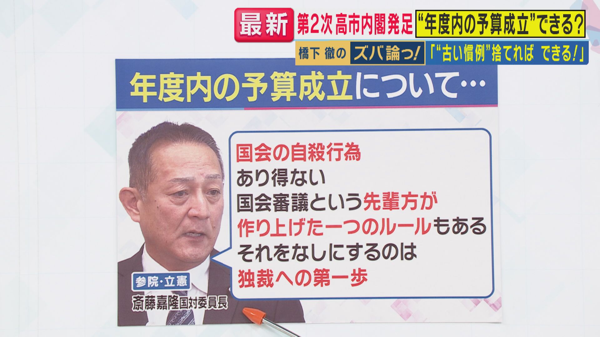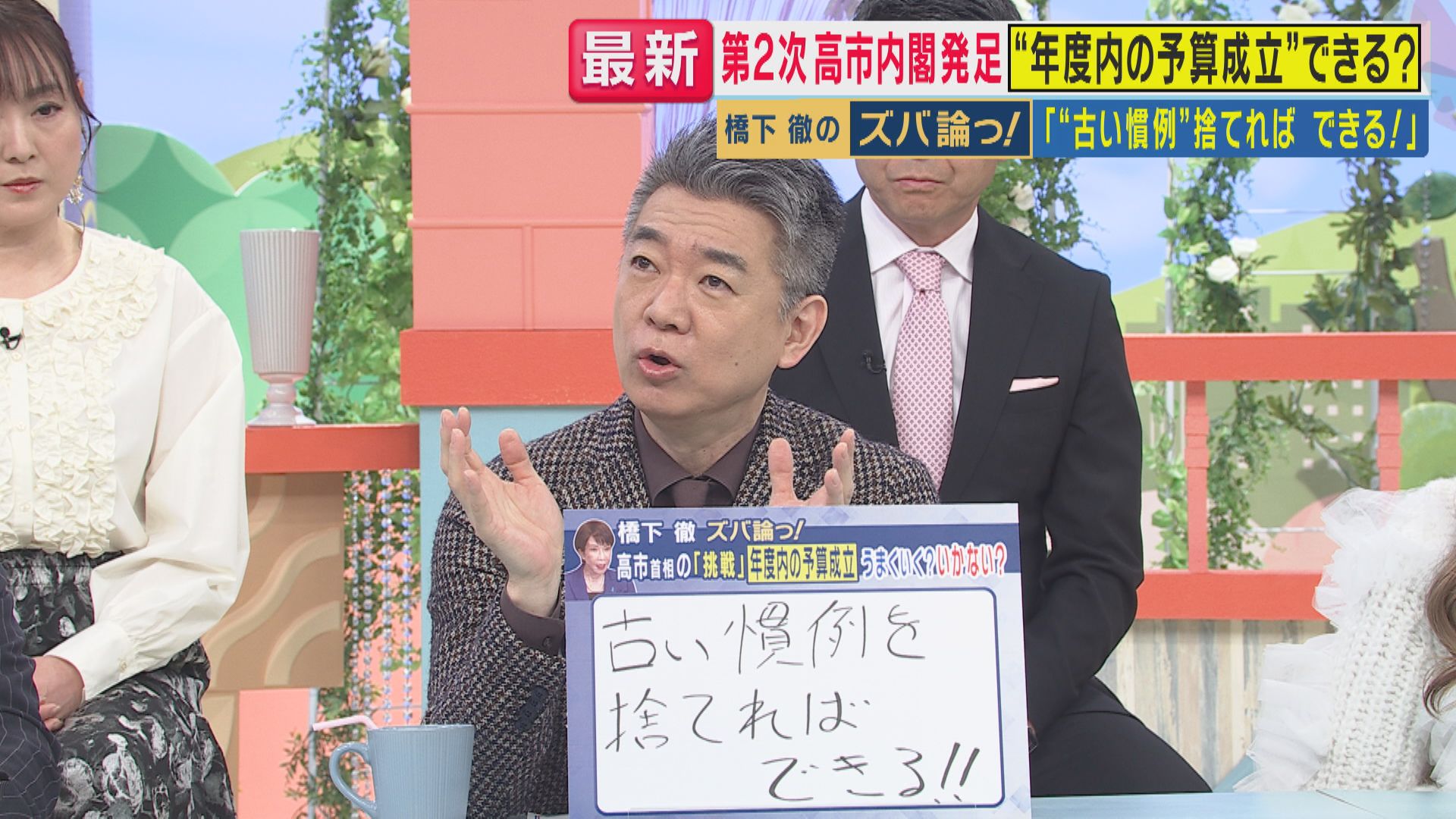 高市内閣の発足と同時に注目されているのが、年度内の予算成立が可能かどうかという点です。橋下さんは「古い慣例を捨てればできる!!」と掲げ、まず、「年度内の成立を目指す場合、議論が短くなって国会軽視だ」という指摘があることを批判しました。