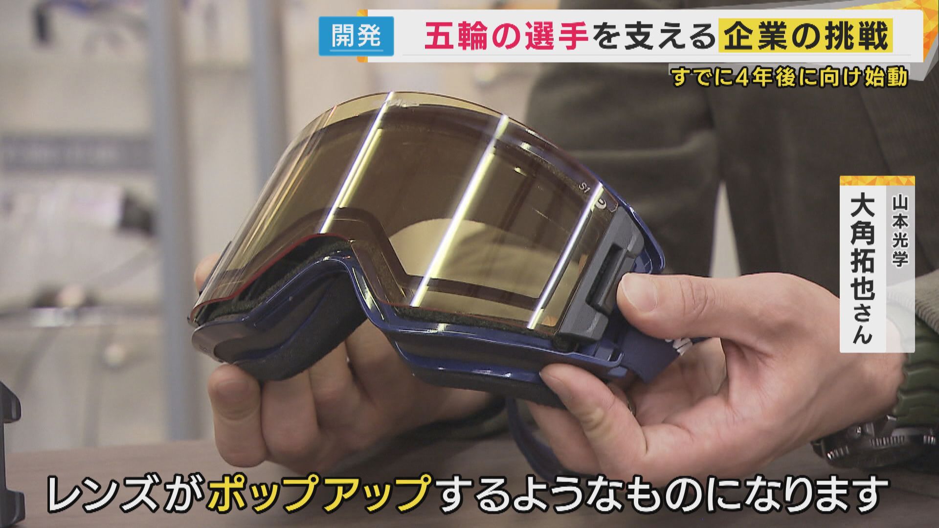 【山本光学 大角拓也さん】「スタート前、曇る心配があると、なかなか集中できないという声も。レンズがポップアップするようなものになります。選手の安心を担っています」