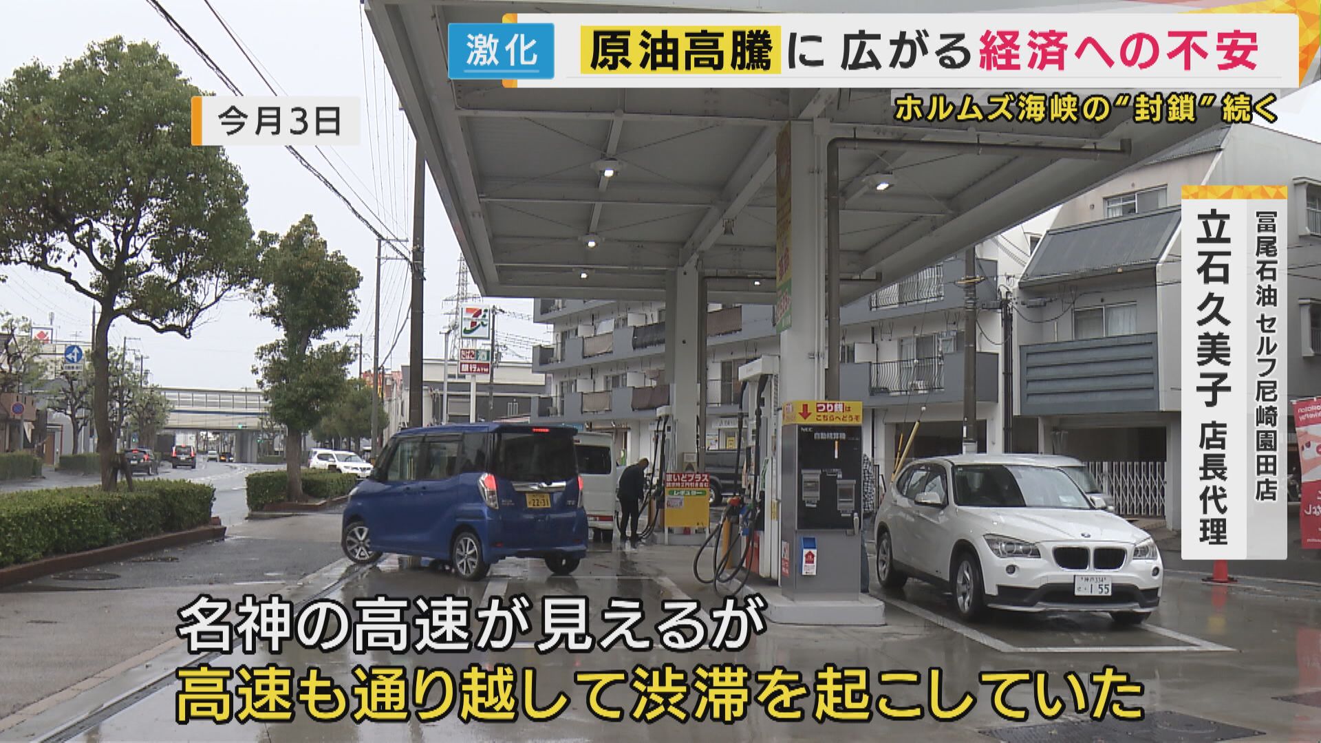 値上がり前に給油しようとする“駆け込み客”が殺到し、隣接する名神高速道路まで渋滞が伸びたといいます。
