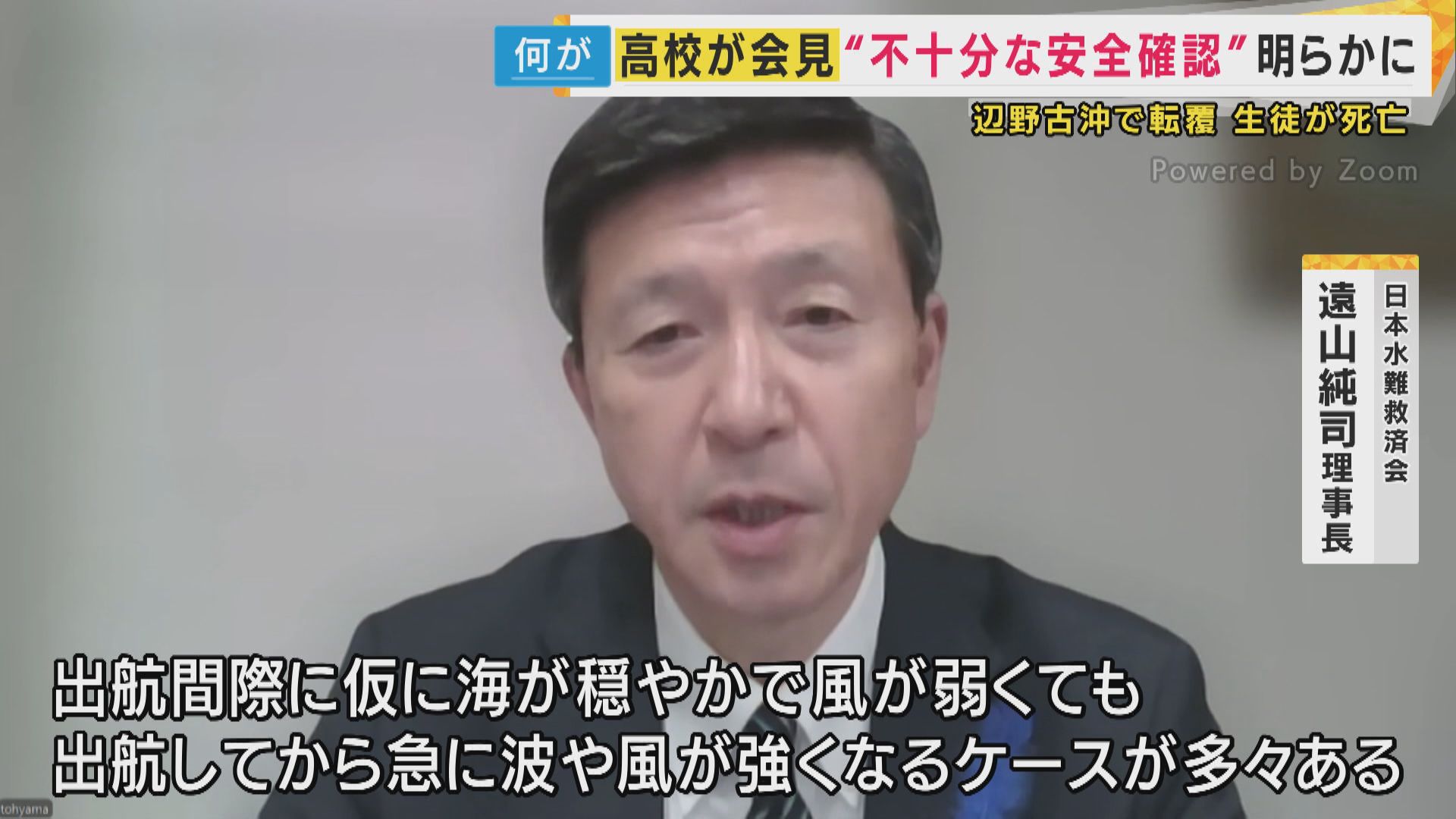 【日本水難救済会・遠山純司理事長】「出航間際に仮に海が穏やかで風弱くてもそのあと出航してから急に波や風が強くなるケースが多々ある。