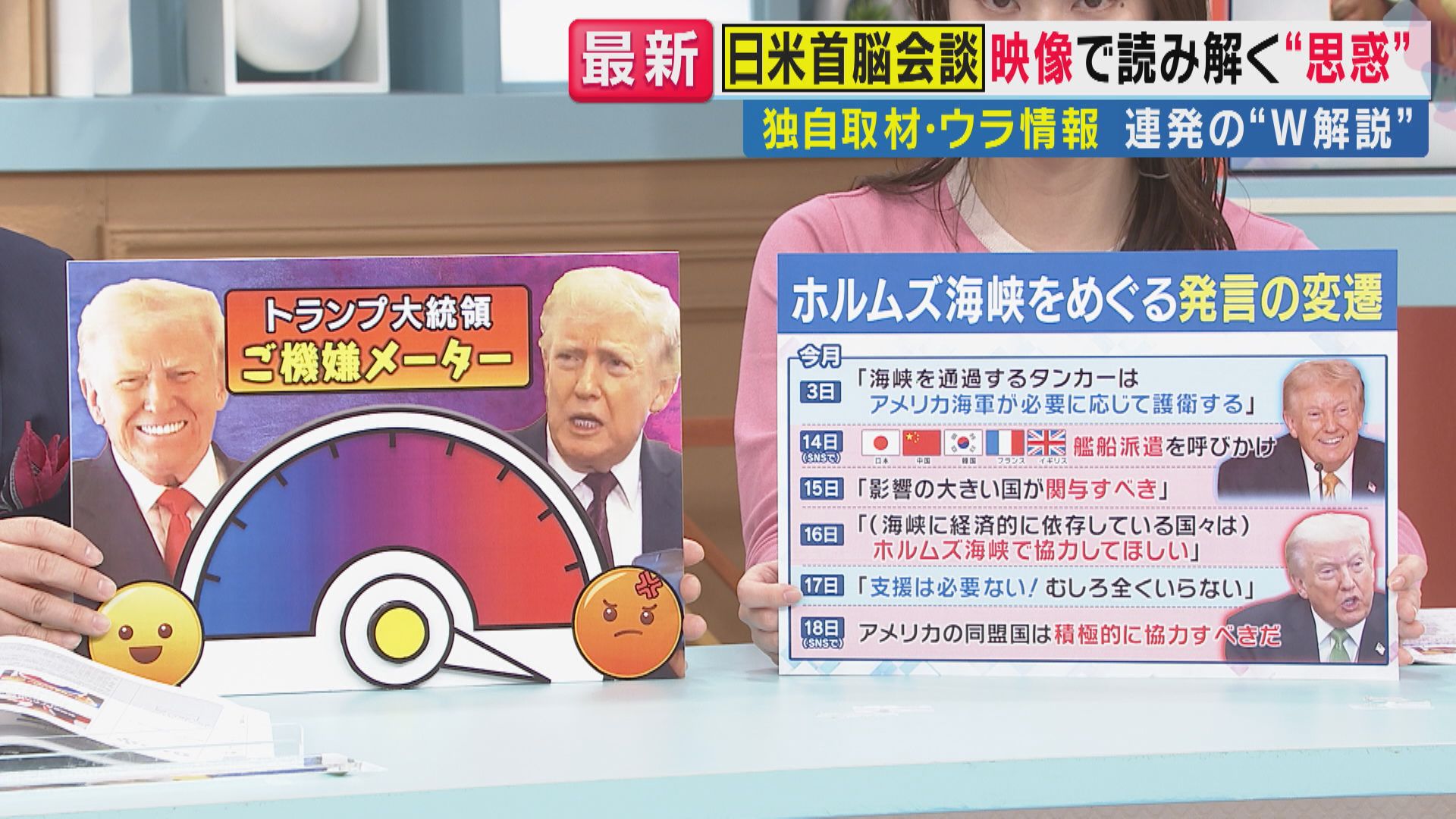 20日放送の「旬感LIVE とれたてっ!」には、米中の安全保障などが専門のキヤノングローバル戦略研究所・峯村健司氏と元NHK政治部記者のジャーナリスト・岩田明子氏が出演し、トランプ大統領の『ご機嫌メーター』を使いながら解説しました。