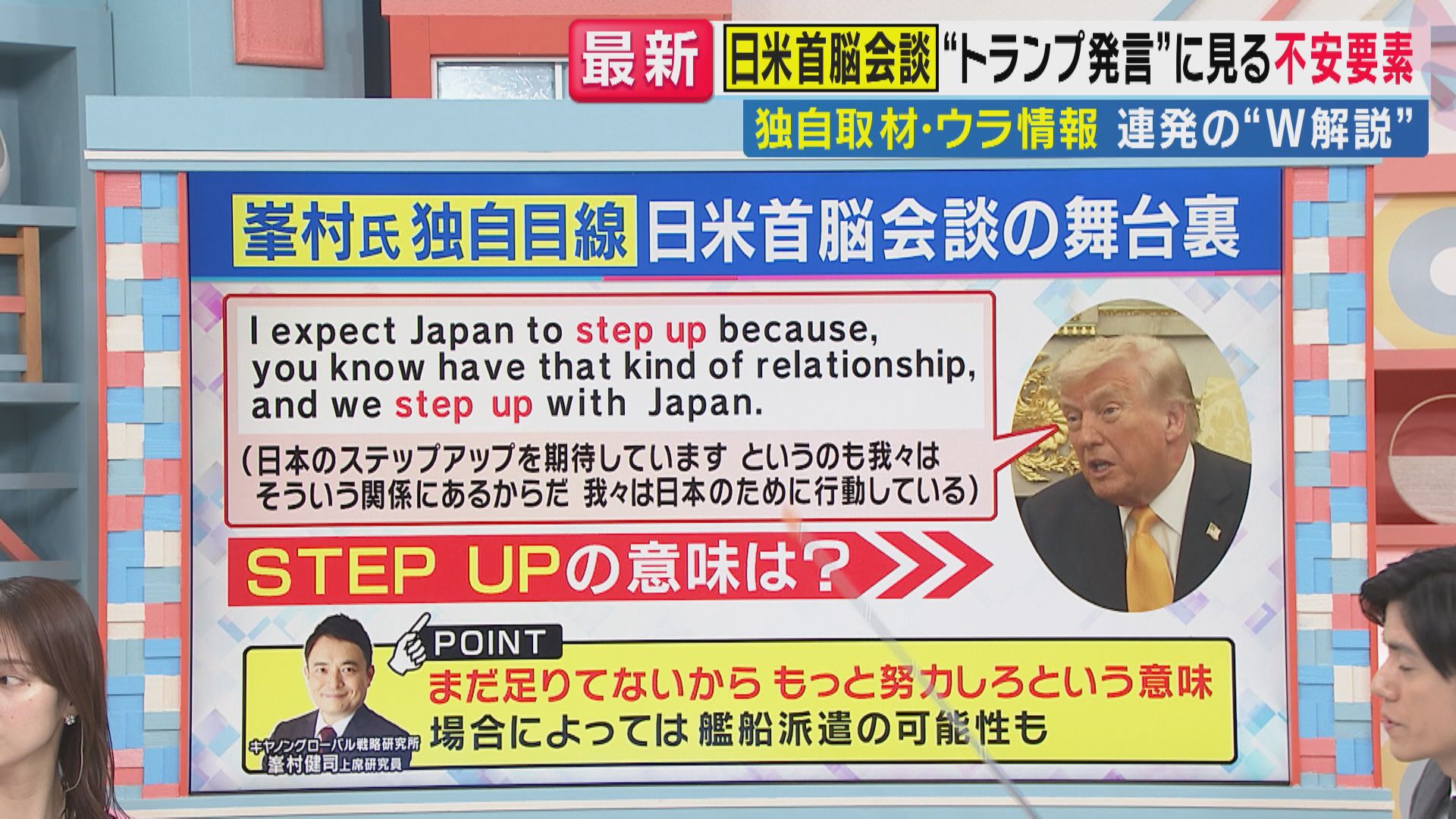 トランプ大統領は会談で「STEP UP」という言葉を何度も使っていて、峯村氏によると「まだ足りてないからもっと努力しろ」という意味合いがあるということです。