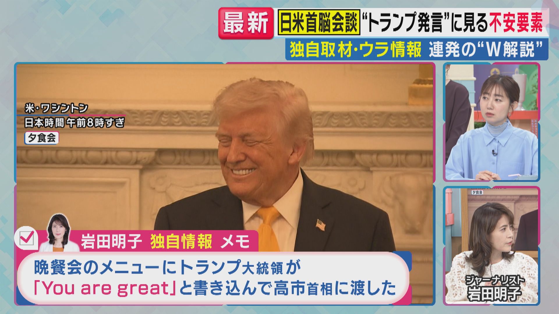 【岩田明子氏】「晩餐会では、高市さんの十八番でもあるX JAPANの『Rusty Nail』が流れる中、両首脳が入り、高市さんは口ずさんでいたようです。あとトランプさんがメニュー表に『You are great』って書いてサインをして、高市さんに渡した。こういうところがトランプ流ですよね」