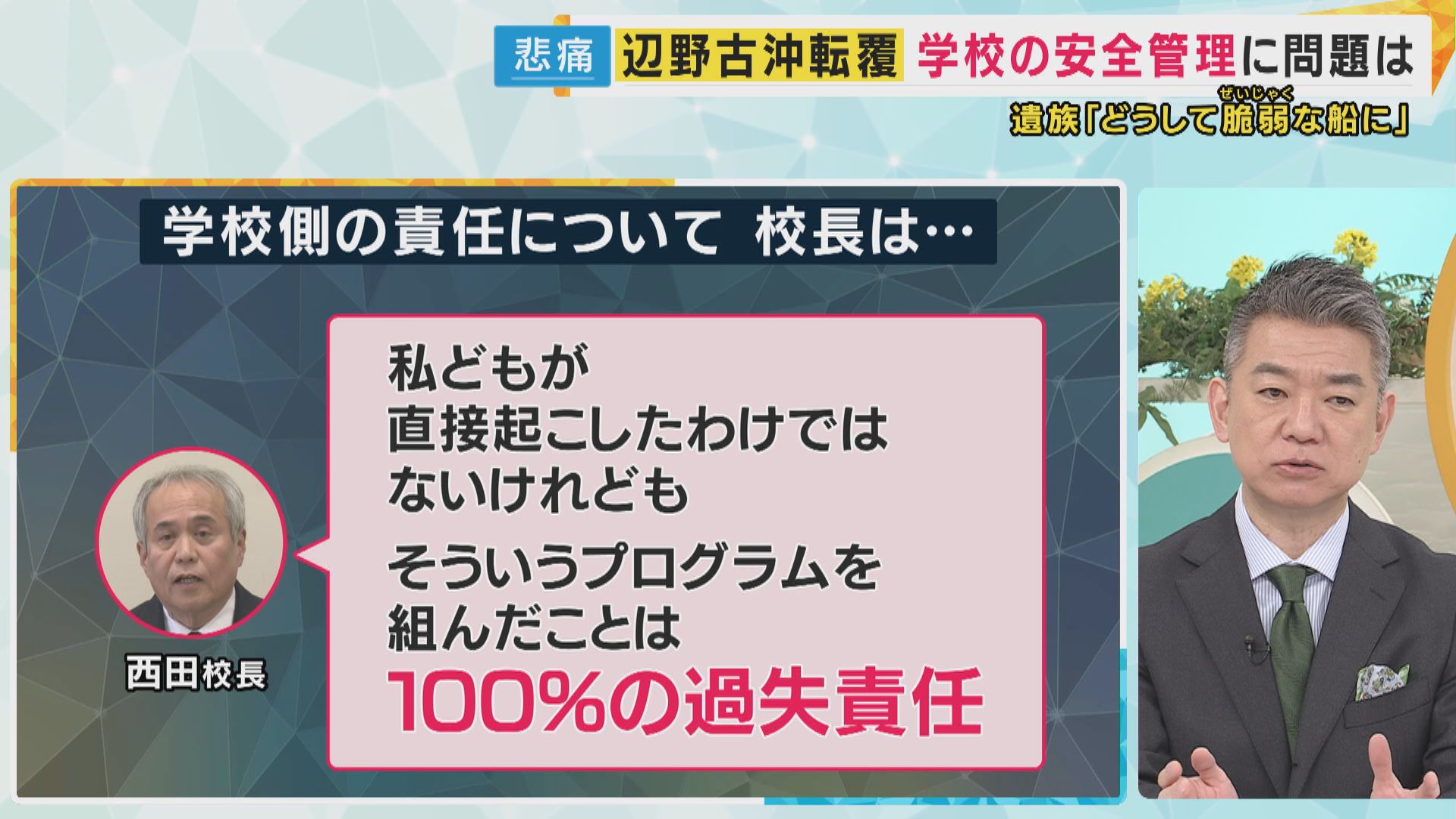 また同じく弁護士で元テレビ朝日アナウンサーの西脇亨輔氏は「修学旅行中の水難事故は『引率の教師が十分な事前調査を行ったかどうか』で責任の有無が判断された」と過去の例を挙げ、今回の学校側の責任について次のように述べました。