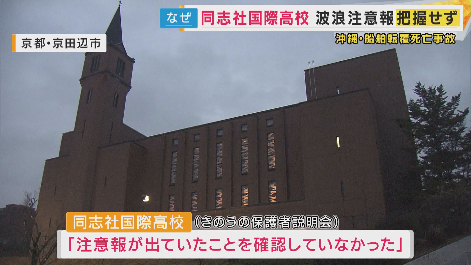 沖縄県の辺野古沖で船が転覆し修学旅行中の同志社国際高校の生徒が死亡した事故で、学校側が当時、波浪注意報が発表されていたことを確認していなかったことがわかりました。