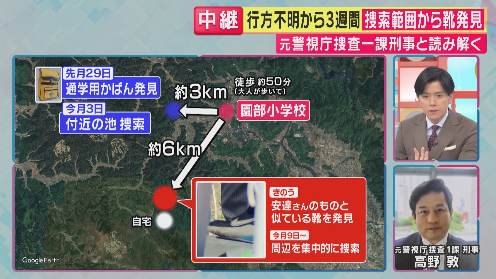 【解説】「靴の発見で事件という見立てが非常に強くなってきたと言えるのでは」元警視庁捜査一課刑事が指摘 通学用かばん発見現場から靴が見つかった現場まで「歩くことはまず考えられない」 京都・南丹市男児不明04月13日 18:00