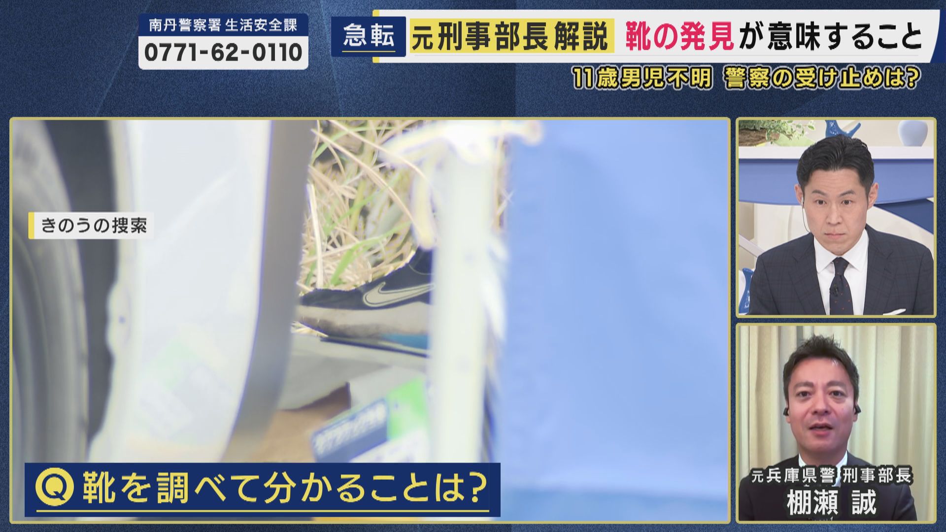 元兵庫県警刑事部長の棚瀬誠氏はこの靴の発見について、「相対的な意味で事件に巻き込まれているという可能性が高まっている」と指摘しました。
