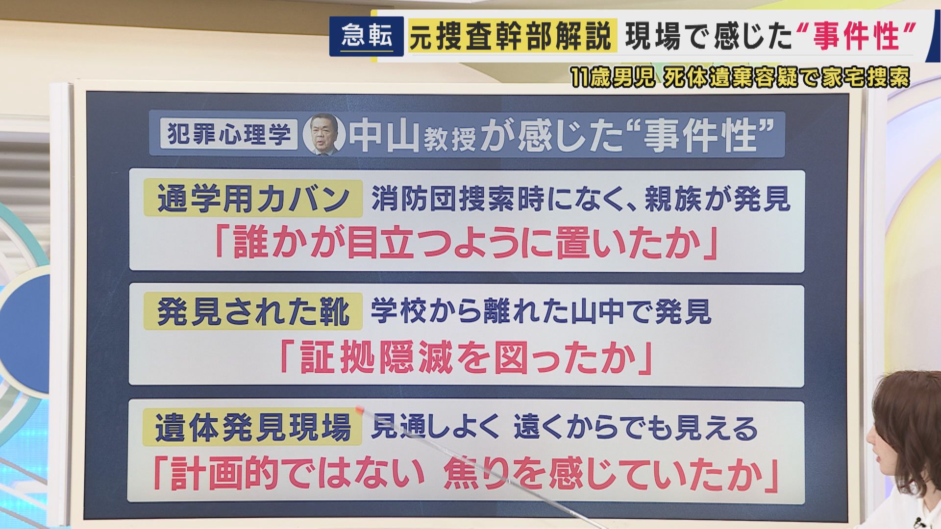 捜索の容疑は死体遺棄だが、中山教授は「今は死体遺棄ということだけでやっているが、おそらく殺人ということまで想定してやっていると思う。犯行場所の特定、例えば車の中に尿失禁の跡がないかどうか、そういった方向で進めていると思います」と述べ、「捜査がすでに犯行立証の段階に向かっている」と解説しました。
