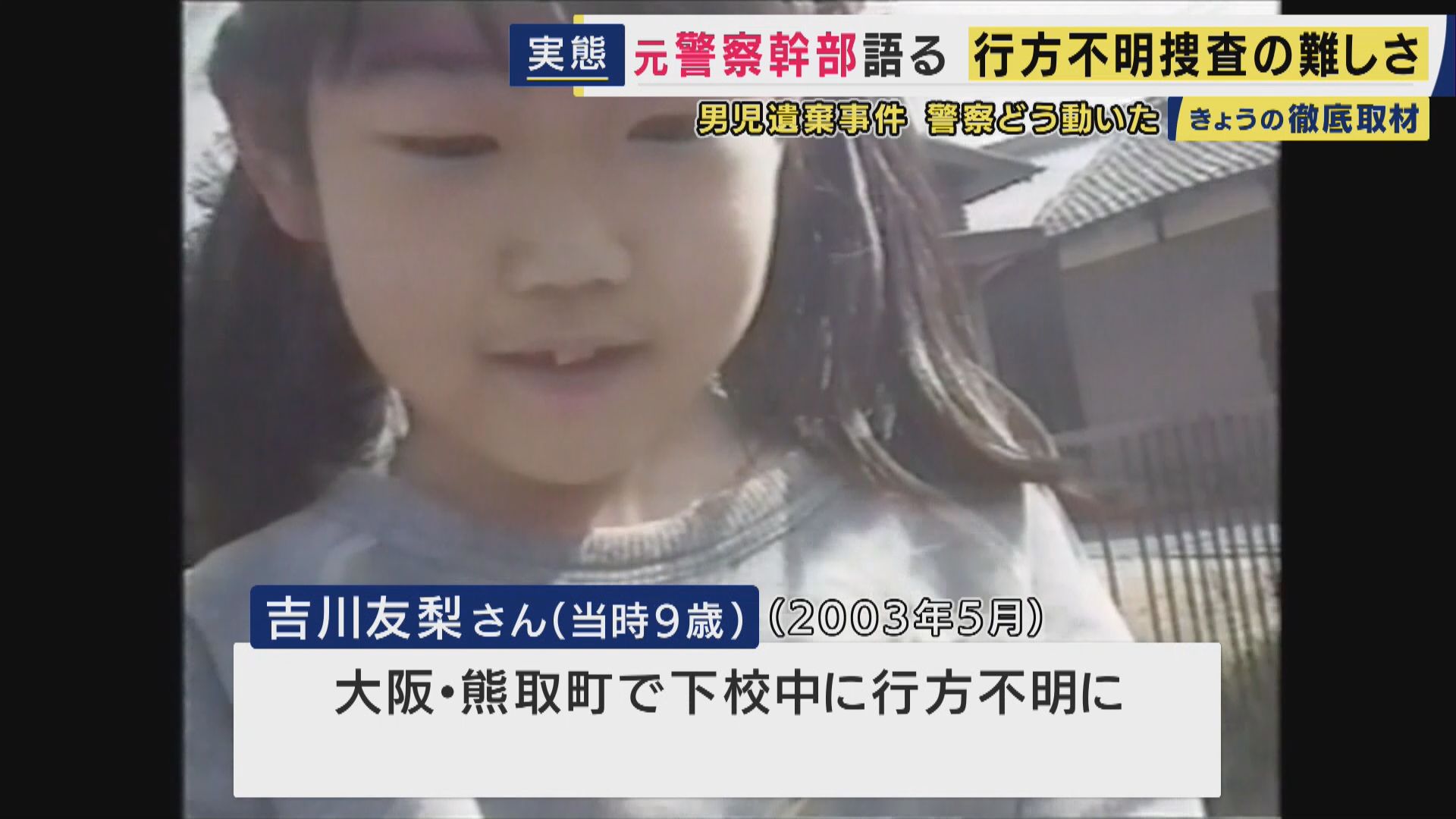 関西では2003年、大阪府熊取町で当時小学4年の吉川友梨さん(当時9)が下校中、行方不明に。