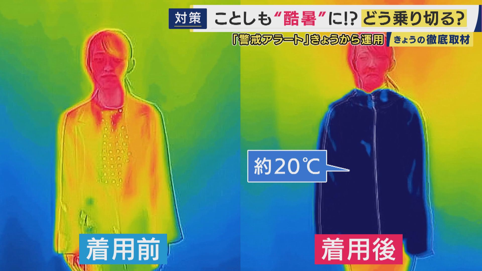 30度に設定した室内で取材班が実際に着用してみたところ、「寒いです、もはや寒い」という声が上がるほどの冷却効果を体感。サーモグラフィーでは顔が35度を超える真っ赤な状態なのに対し、服の部分は20度ほどで真っ青に映し出されました。