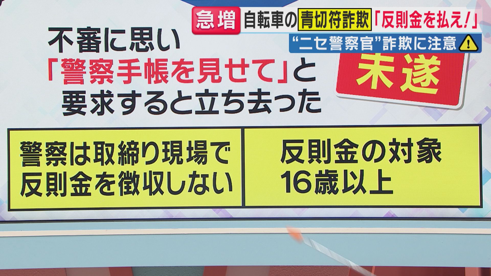 4月から施行された自転車の交通違反に反則金を科す「青切符制度」を悪用し、警察官を装って現金を騙し取ろうとする詐欺が全国各地で相次いでいます。