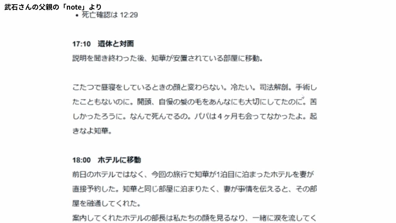 【武石知華さんの父親の「note」より】「こたつで昼寝をしているときの顔と変わらない。冷たい。司法解剖。手術したこともないのに。開頭、自慢の髪の毛をあんなにも大切にしてたのに。苦しかったろうに。なんで死んでるの。パパは4ヶ月も会ってなかったよ。起きなよ知華」