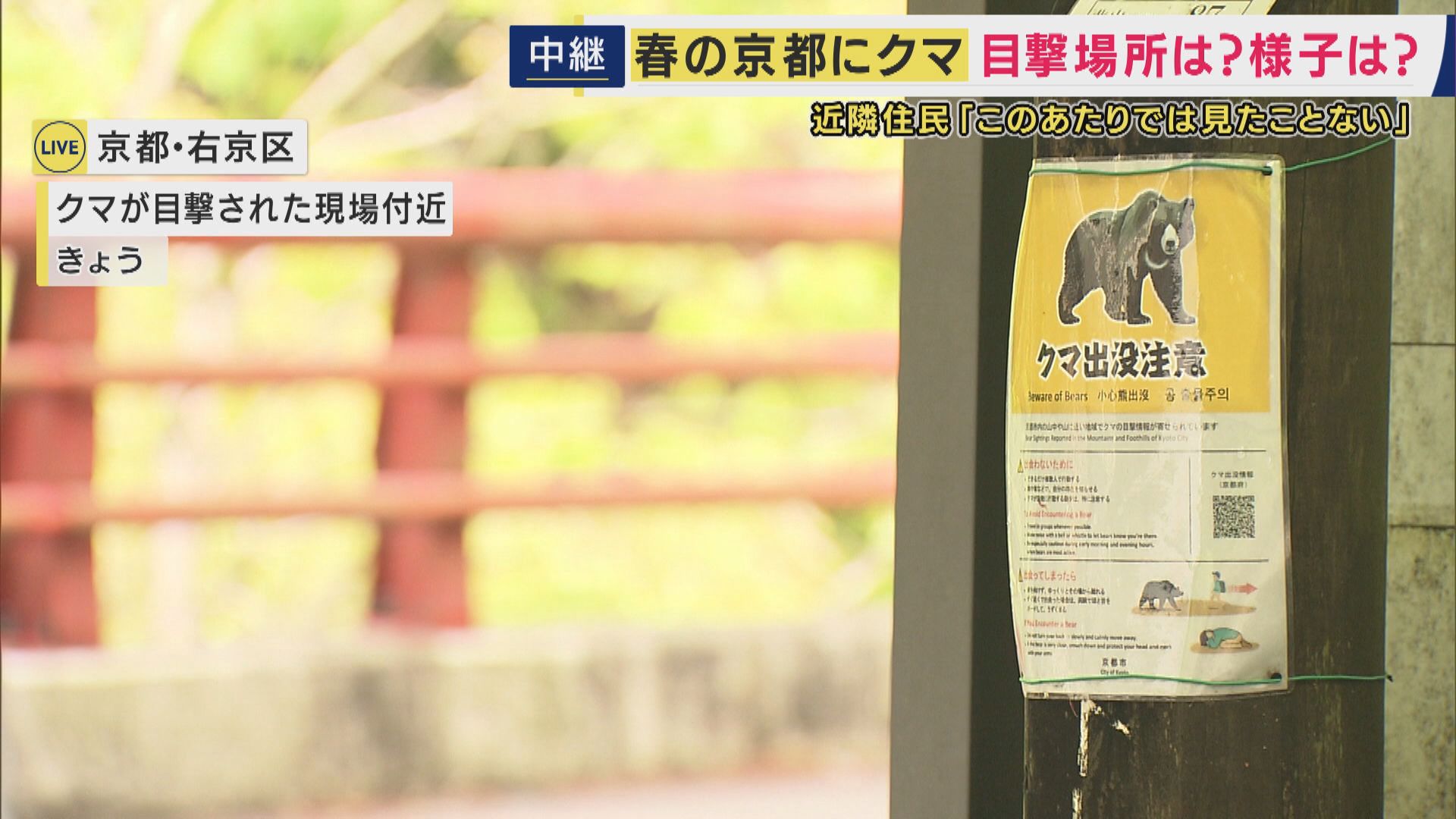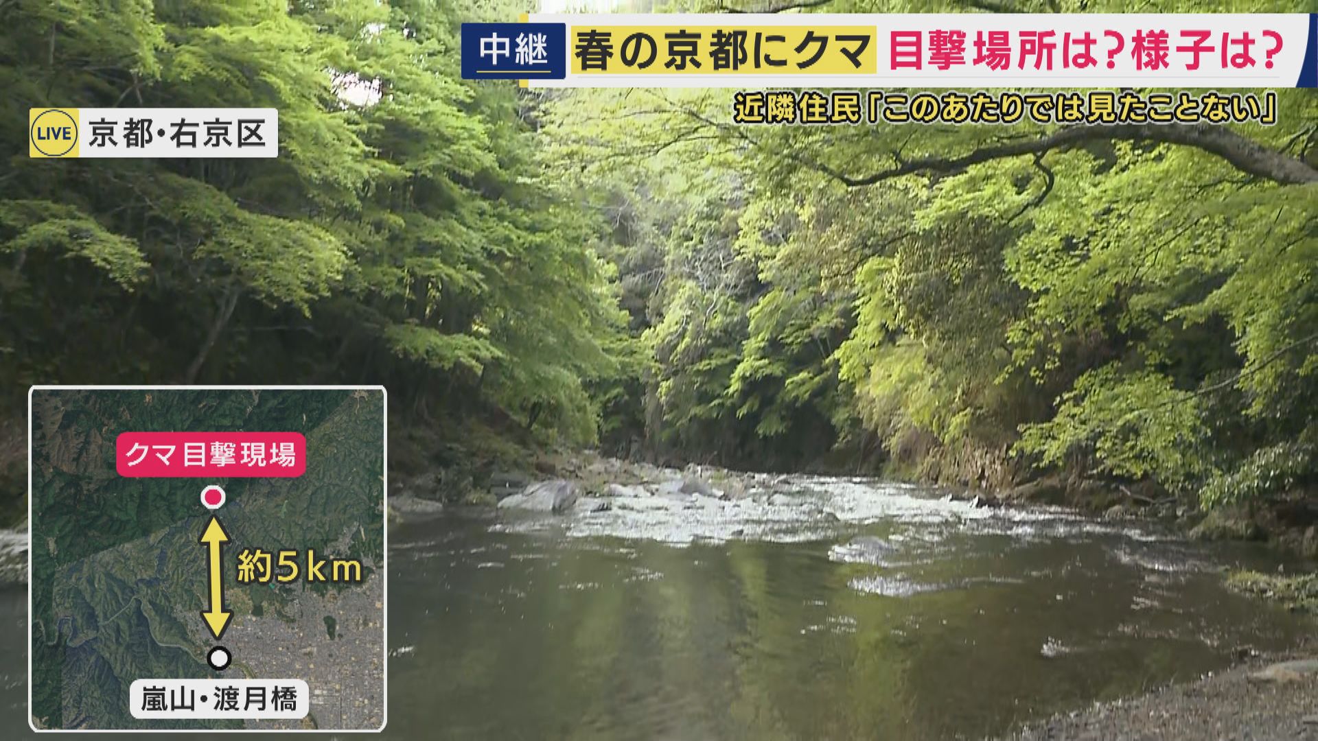【現場報告】京都・嵐山付近でクマ目撃情報「体長1.8メートルのクマ1頭と小グマ2頭」「北に逃げて行った」 遭遇したら“騒がずに後ずさりを”04月27日 18:32
