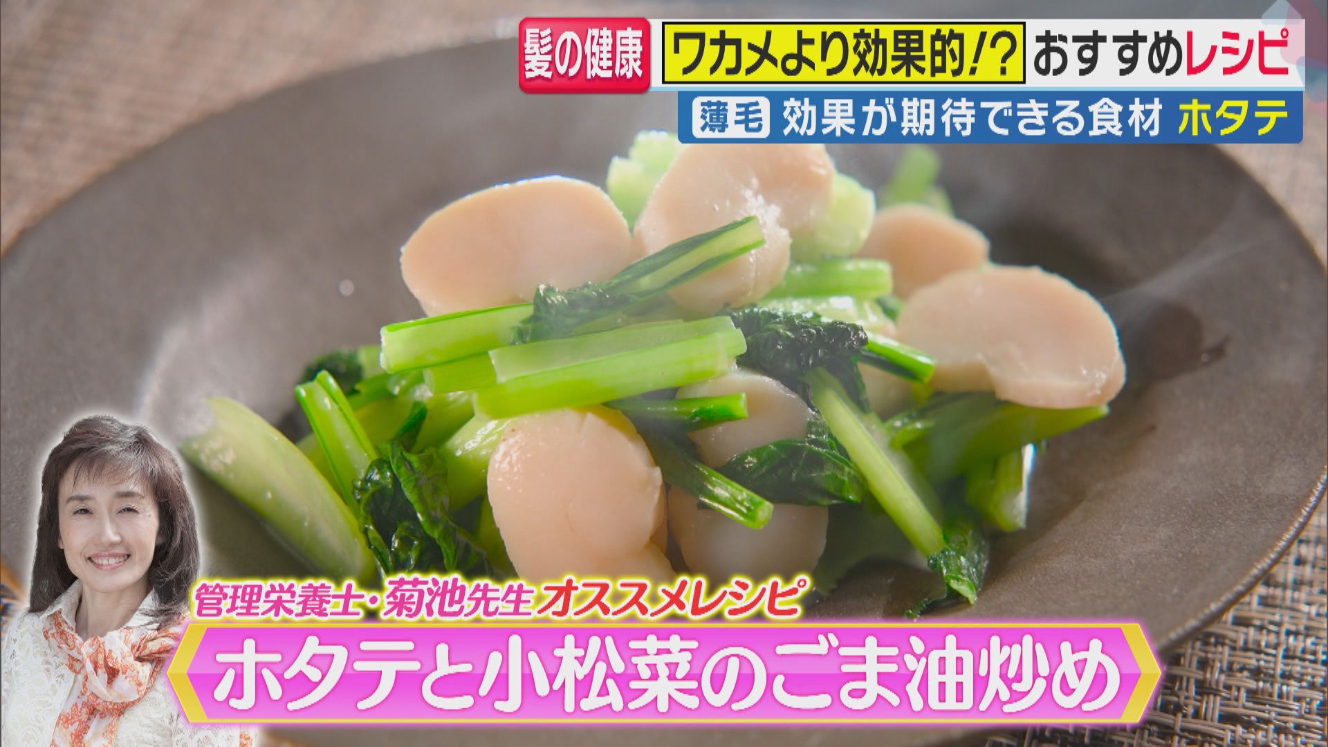おすすめレシピは「ホタテと小松菜のごま油炒め」。小松菜の鉄分とビタミンAが頭皮の乾燥を防ぎ、髪を伸ばすことをサポートしてくれます。