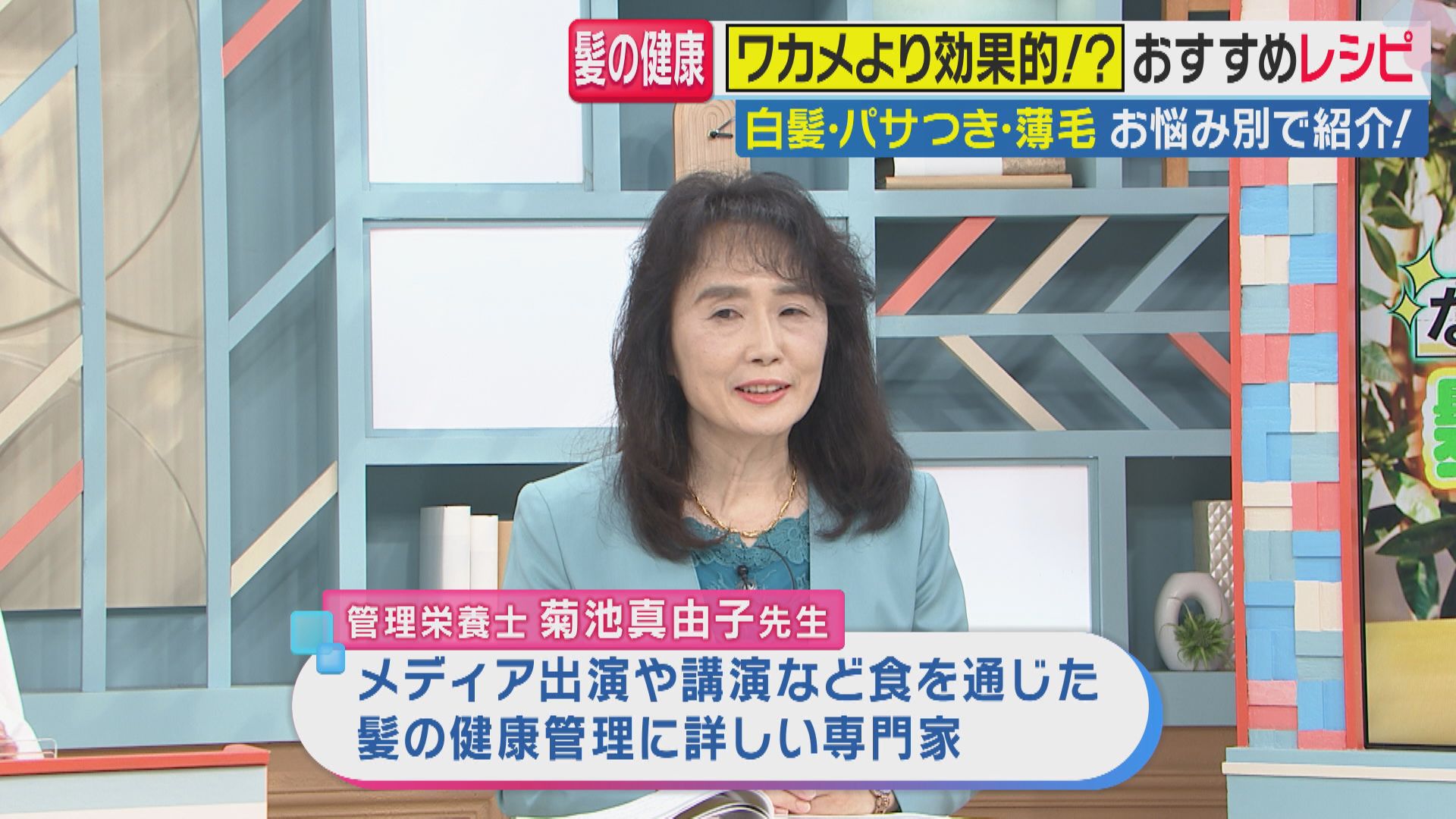 関西テレビ「旬感LIVE とれたてっ!」では、管理栄養士の菊池真由子さんがゲスト出演。白髪・パサつき・薄毛のお悩み別に、髪の健康をサポートする食材とレシピを紹介しました。