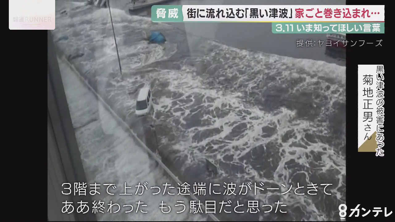 「3階まで上がった途端に波がドーンときて、ああ終わった、もうだめだと思った。(津波は)真っ黒です。家が持ち上がってそのまま流された。蛇行していっている」