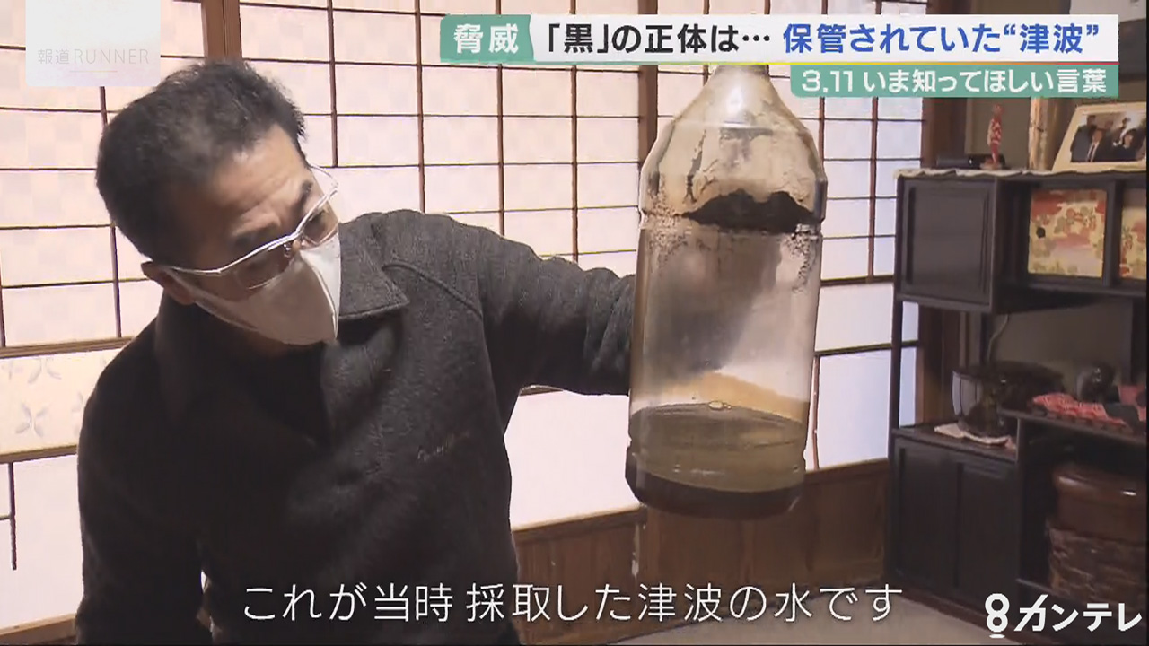「これが当時採取した津波の水です。沈殿している状態なので、上が海水、下にヘドロ、砂などが沈んでいる」