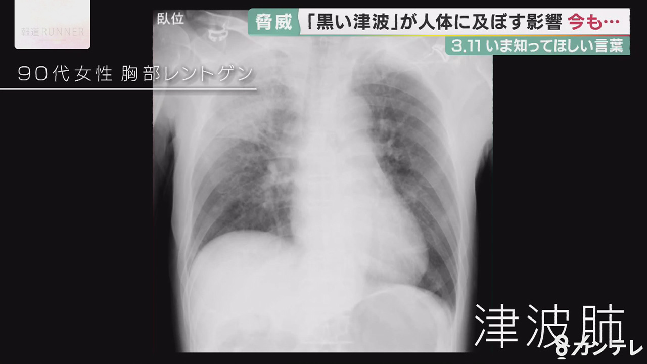 「黒い津波」に流された90代の女性のレントゲン写真。広範囲に白い影があり、「津波肺」と呼ばれる重い肺炎症状がみられます。海水とともに汚れた泥などを飲み込んだことが原因とみられ、女性は搬送から4日後に死亡しました。