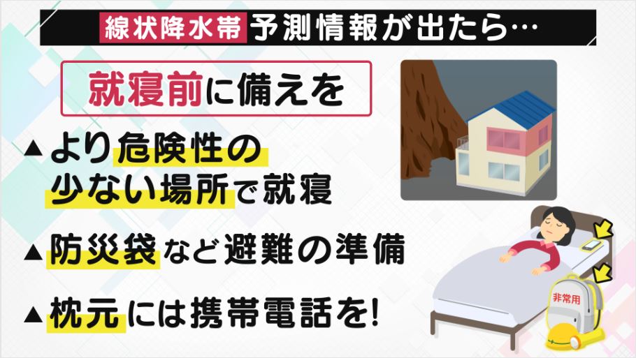 「就寝前の備えを、普段より一段階上げてください。崖などから遠い部屋で寝る、『逃げて』という情報が出た時にすぐに対応できるよう防災袋や携帯電話を枕元に置いておくなど、対策を取るために予測を活用してください」