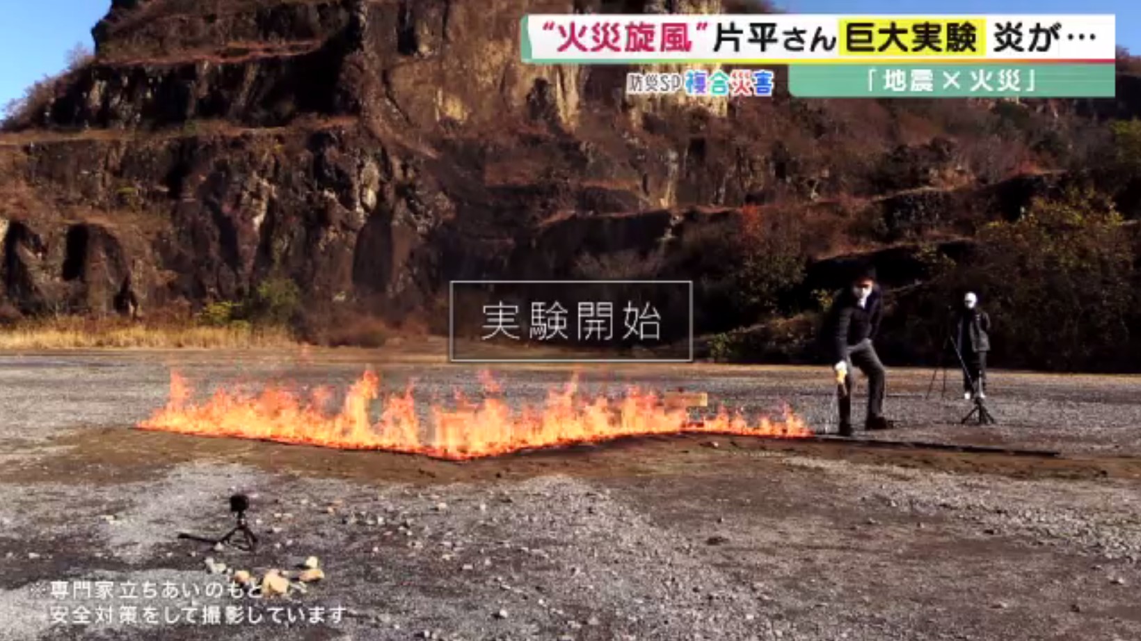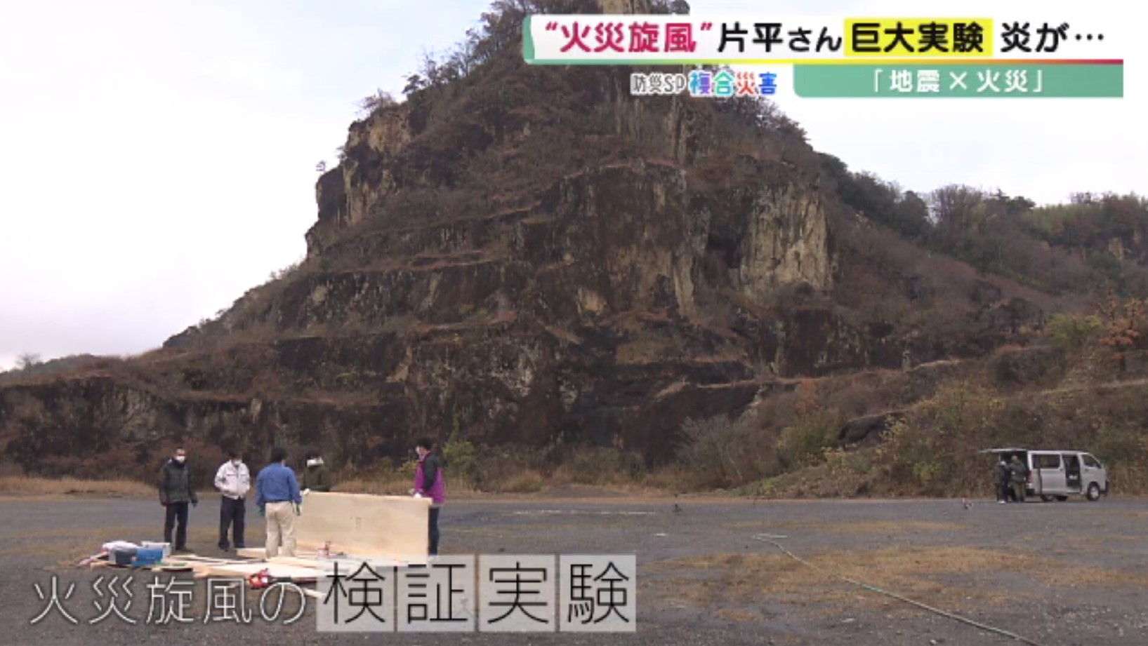 番組では火災旋風の詳細な動きを再現するため、桑名教授のほか、火災旋風の屋外実験に詳しい関本孝三技術士とともに、安全な採石場で大がかりな検証実験を行いました。