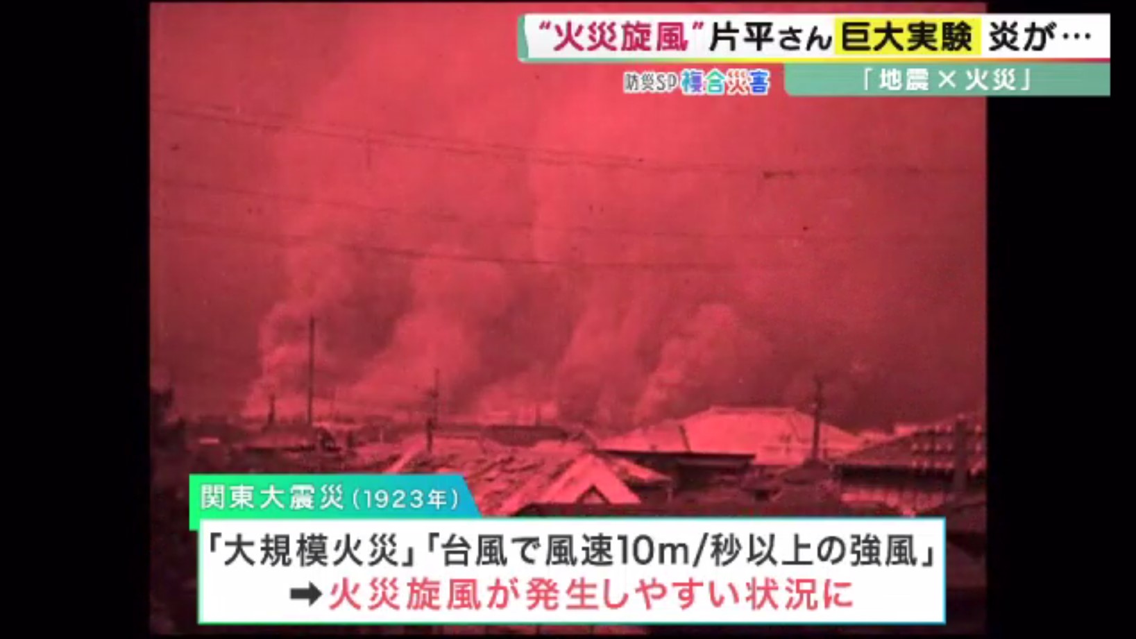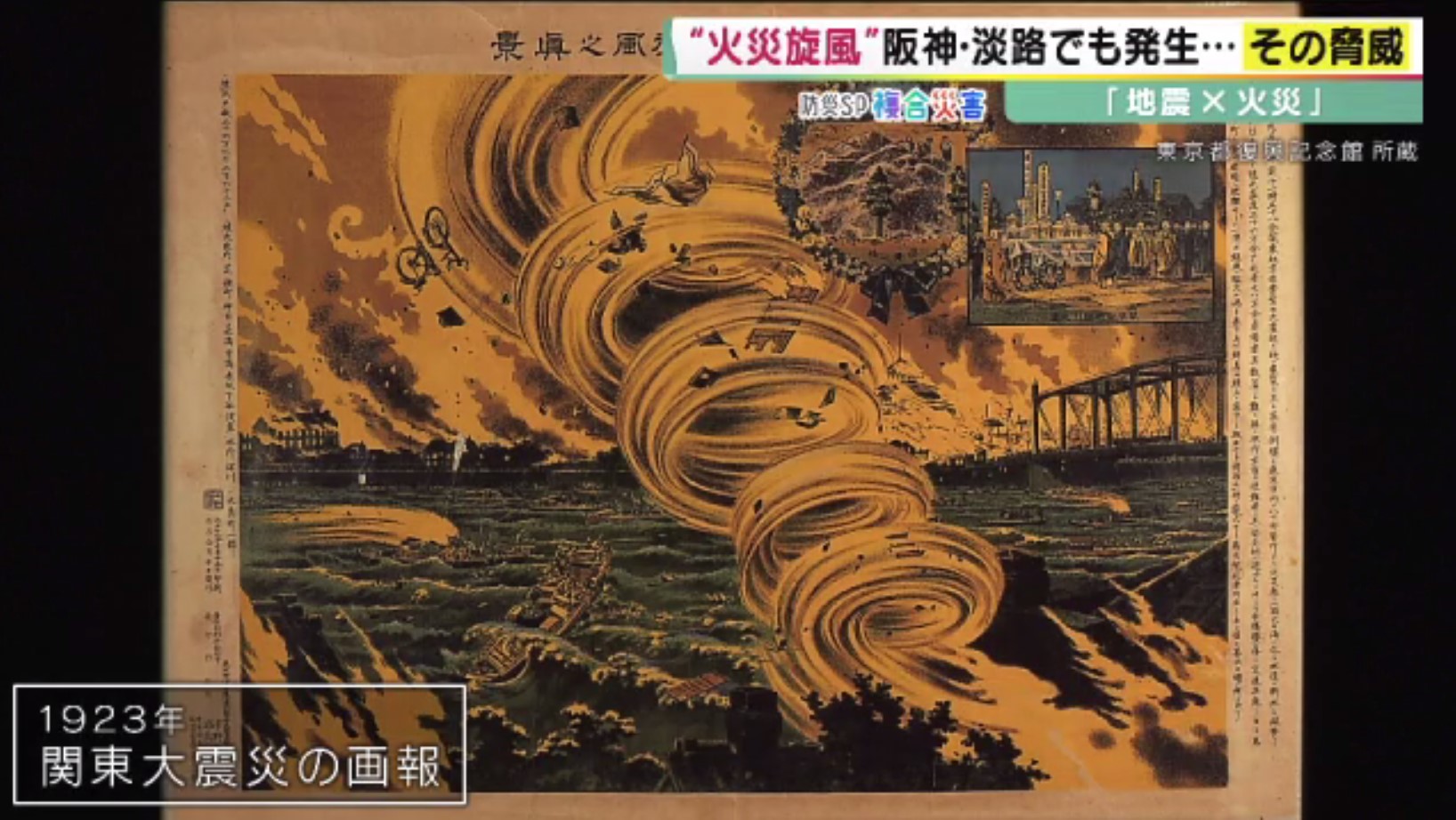 震度7の揺れが襲った街では大規模な火災が多発し、台風の接近で風速10m以上の強風が吹いていたため、火災旋風が発生しやすい状況となりました。